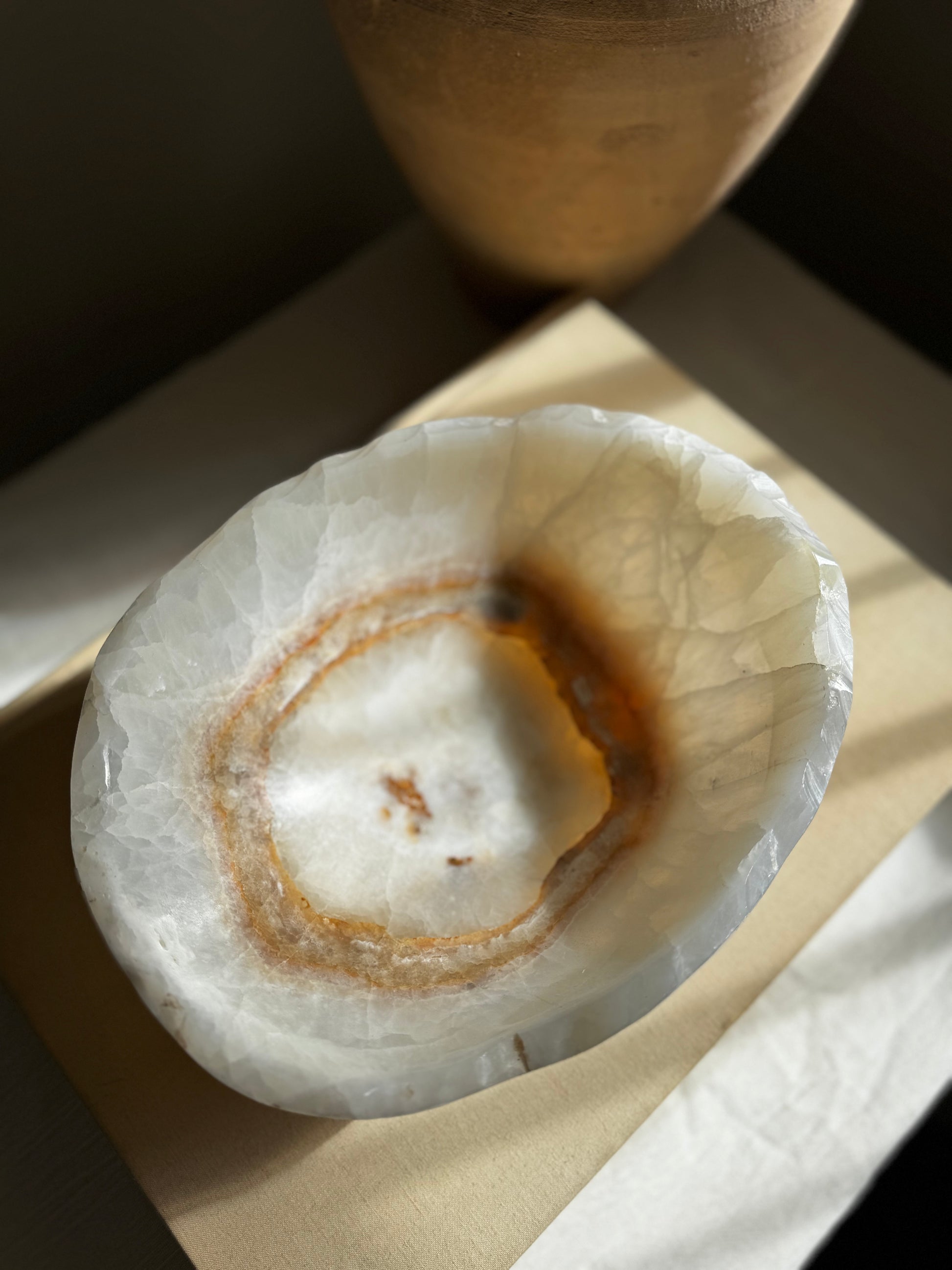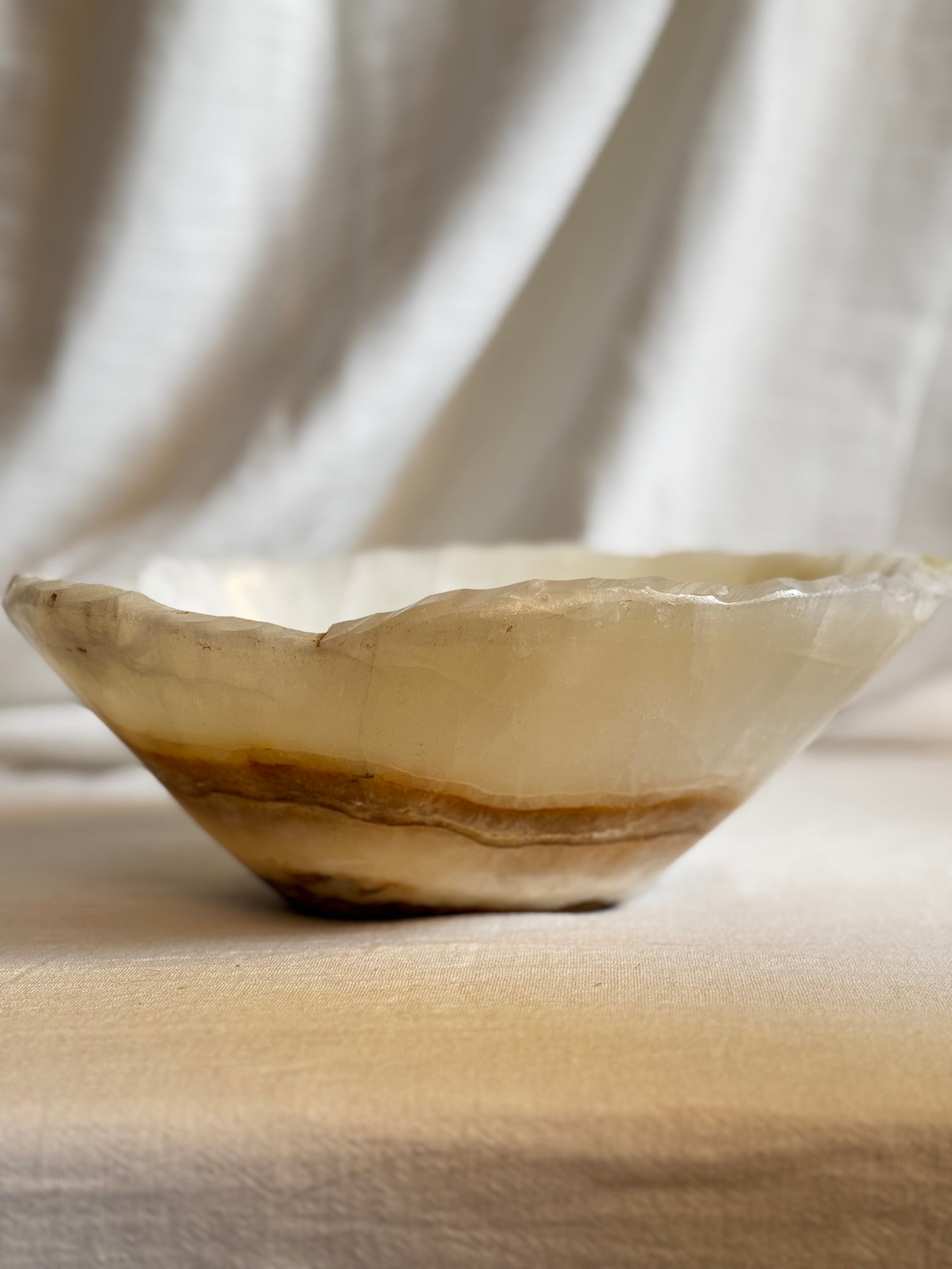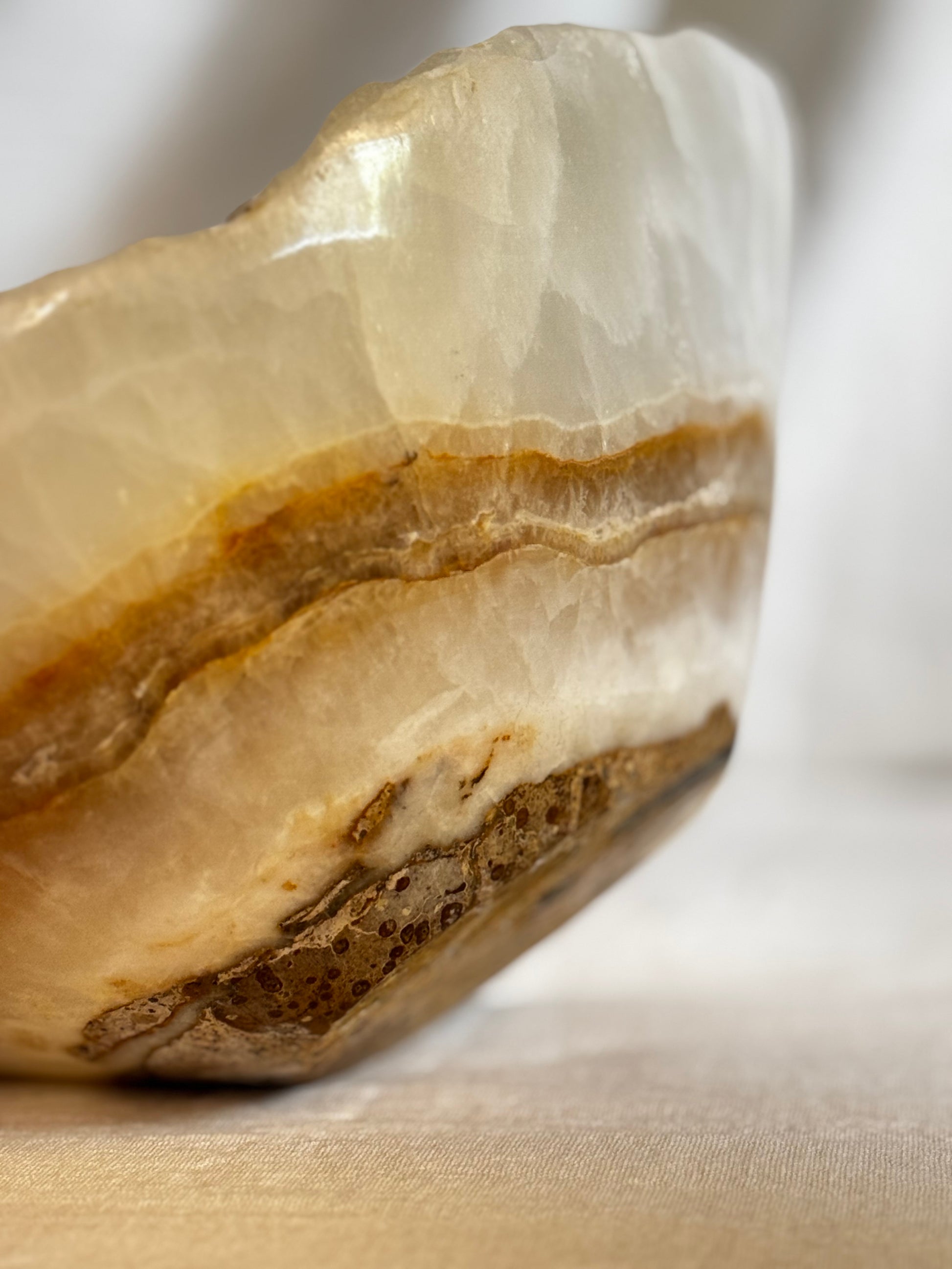 Bring sophistication and elegance to your space with our Amber Onyx Bowl, hand-carved by skilled artisans in Indonesia. This unique piece, made from amber onyx stone, features stunning raw edges, warm brownish rings, and rich, earthy hues.