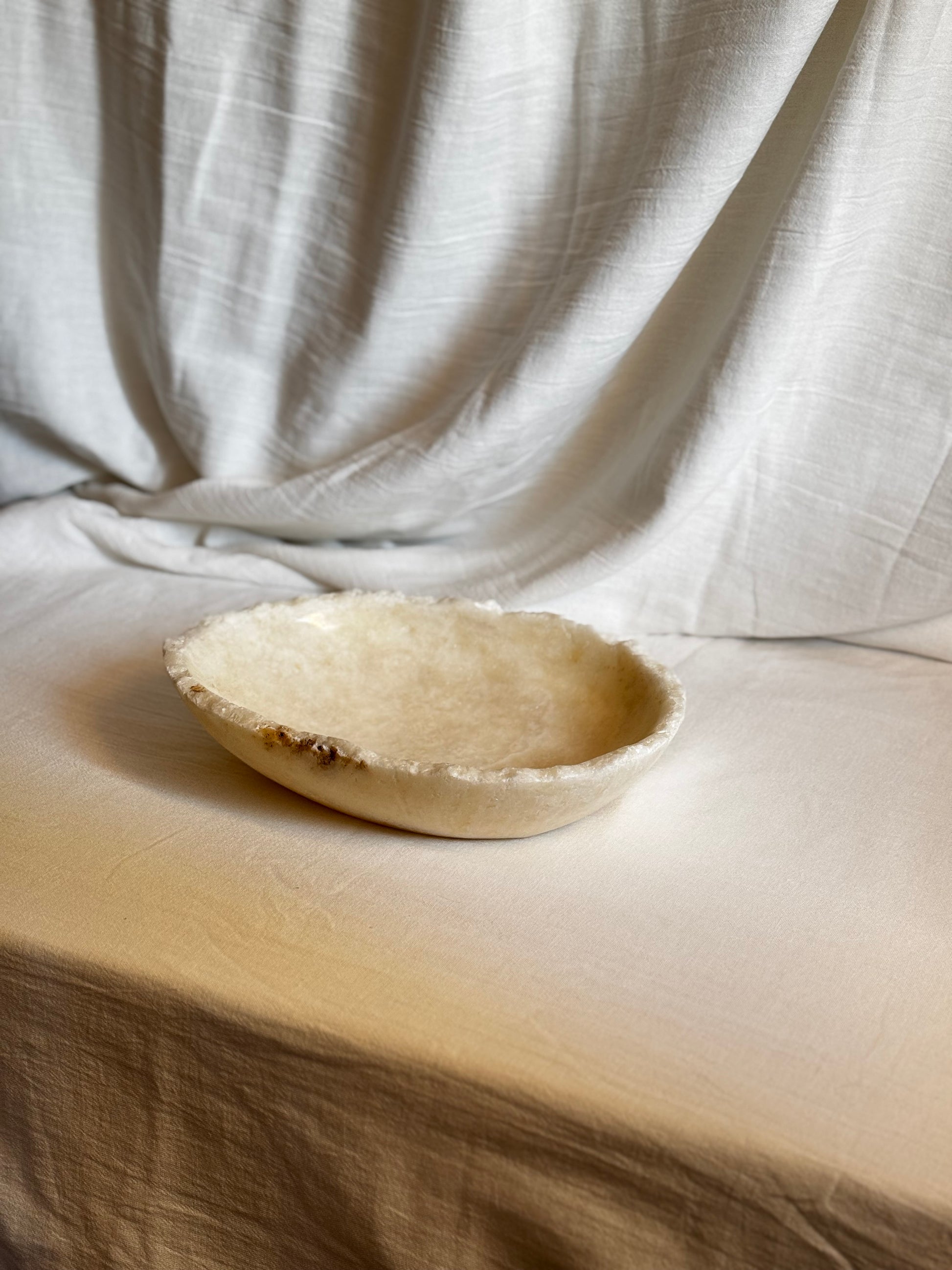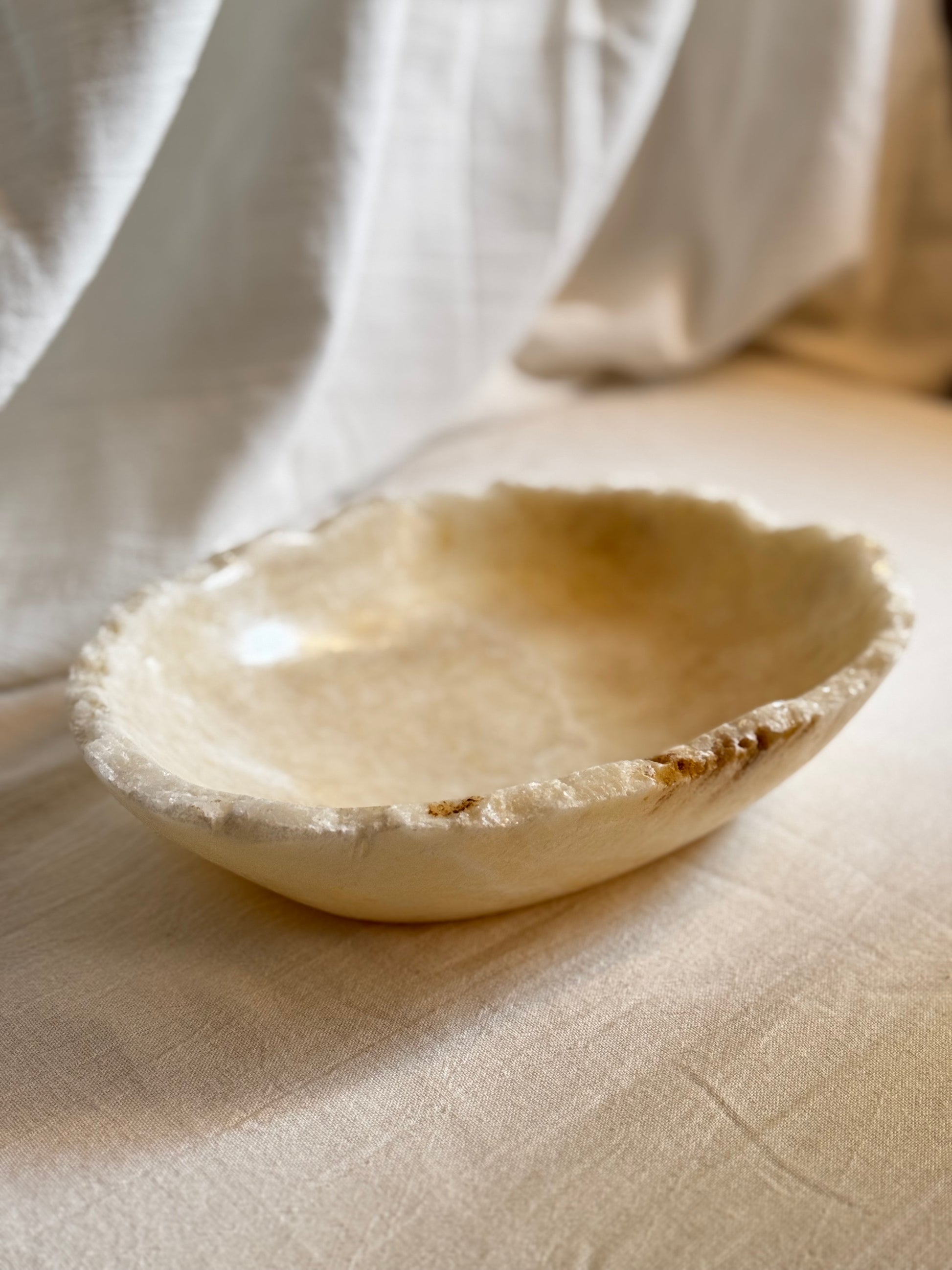 Bring sophistication and elegance to your space with our Amber Onyx Bowl, hand-carved by skilled artisans in Indonesia. This unique piece, made from amber onyx stone, features stunning raw edges and warm earthy hues.