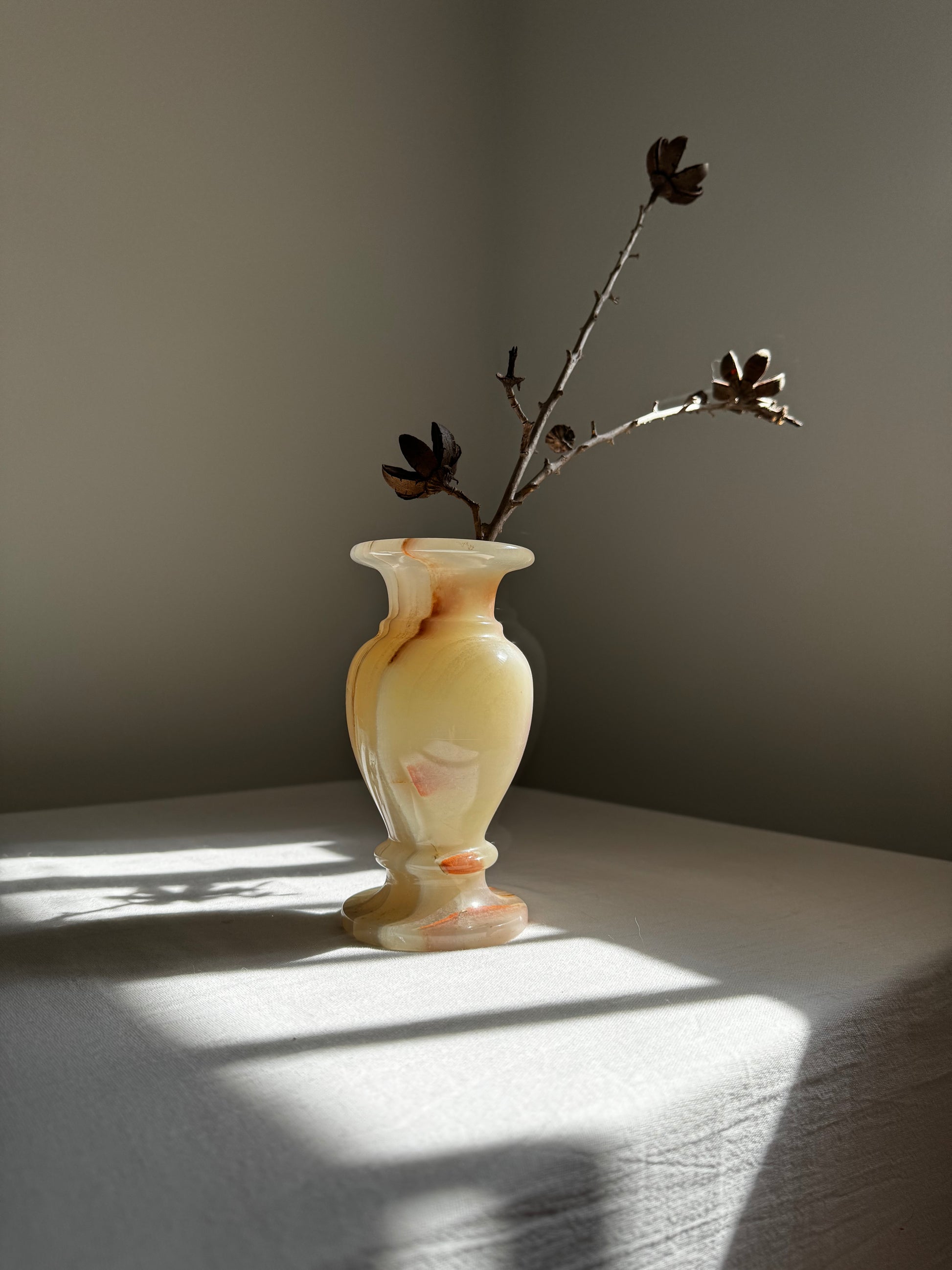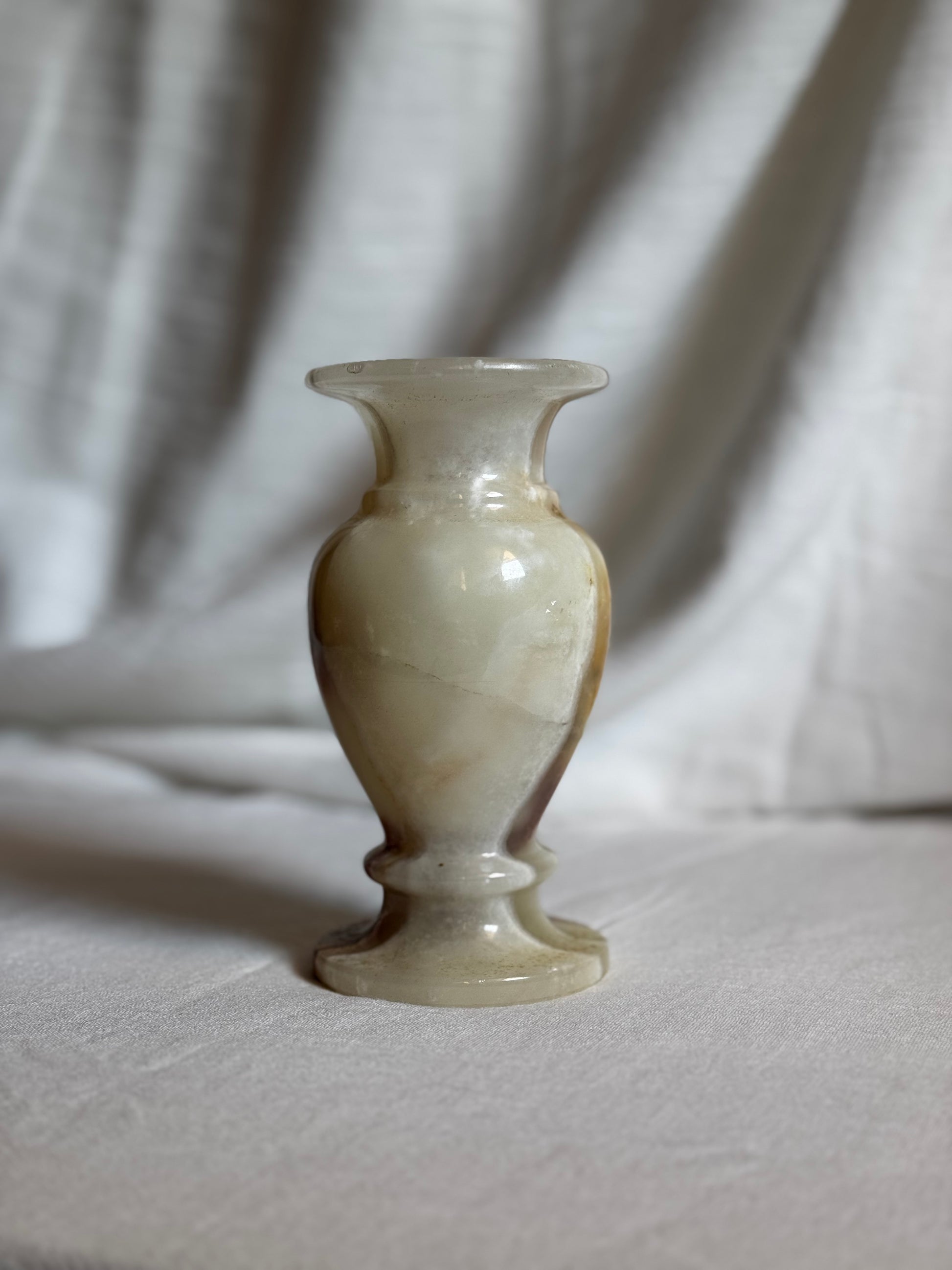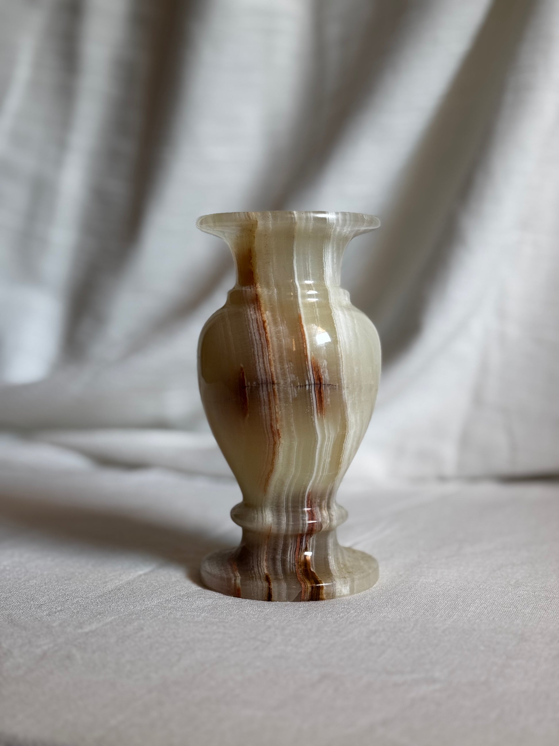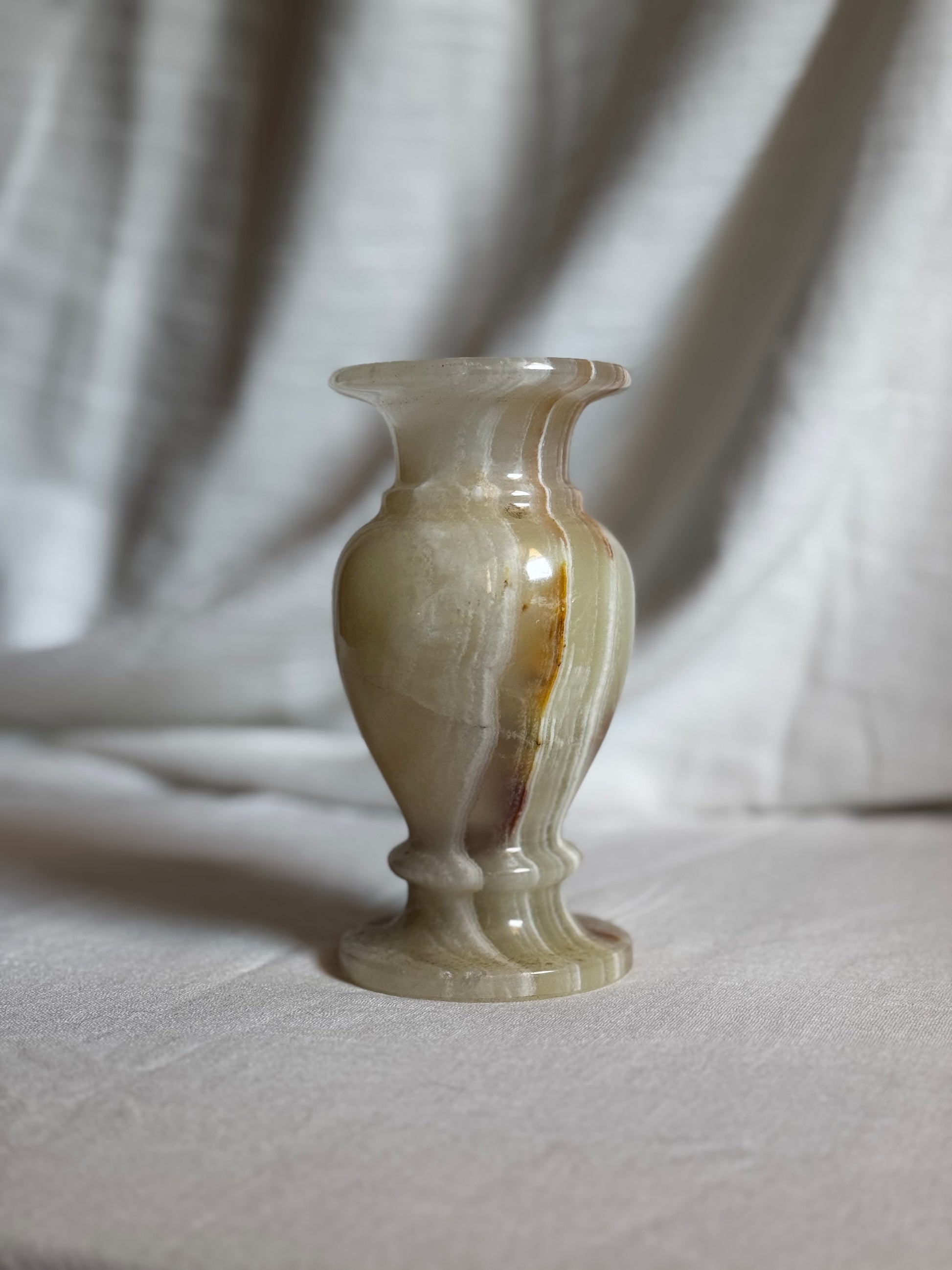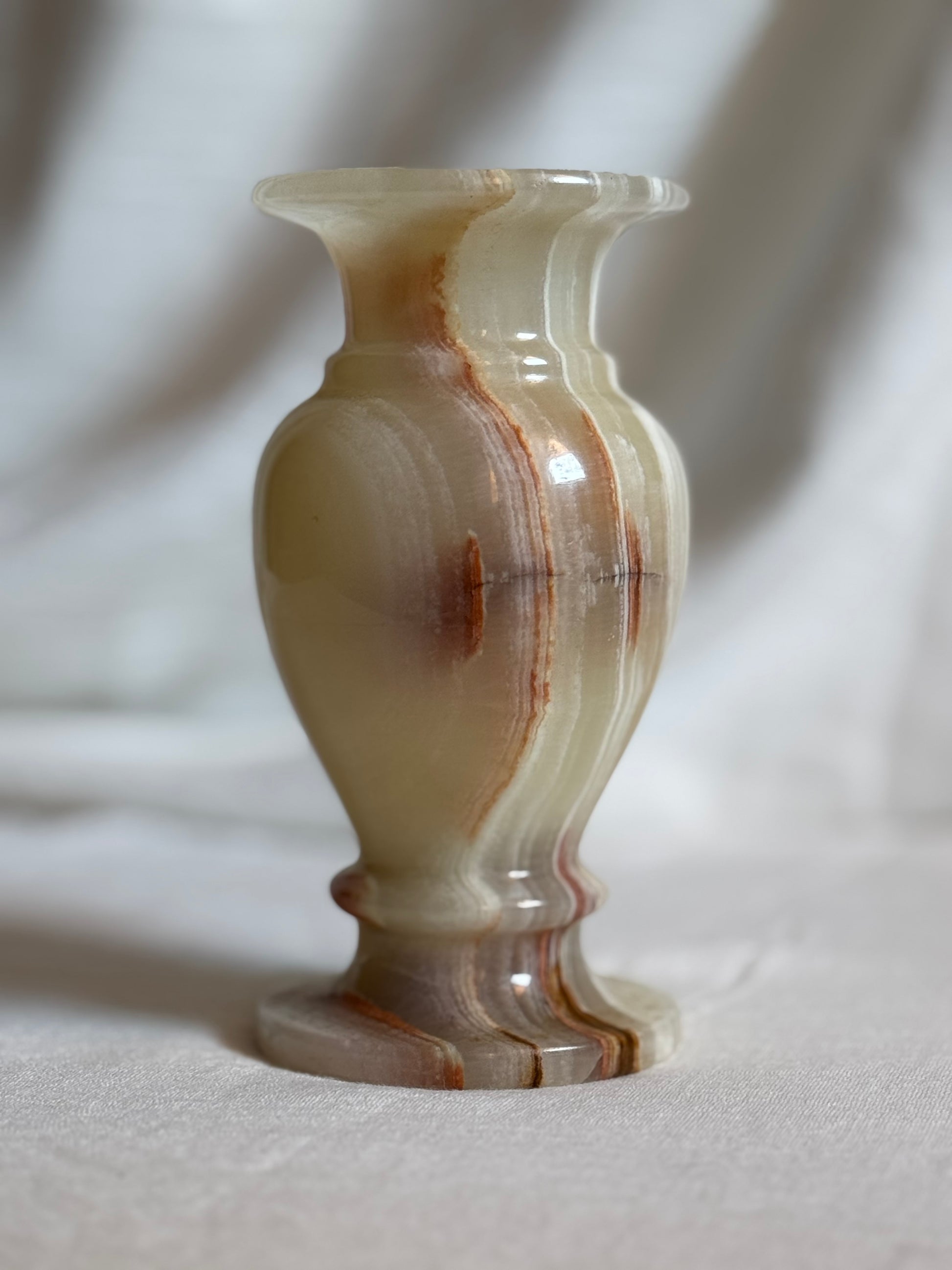Stunning Green Onyx vase from Pakistan. This vase showcase a blend of pale green, white, warm brown and subtle red hues, creating a symphonic and organic color composition.