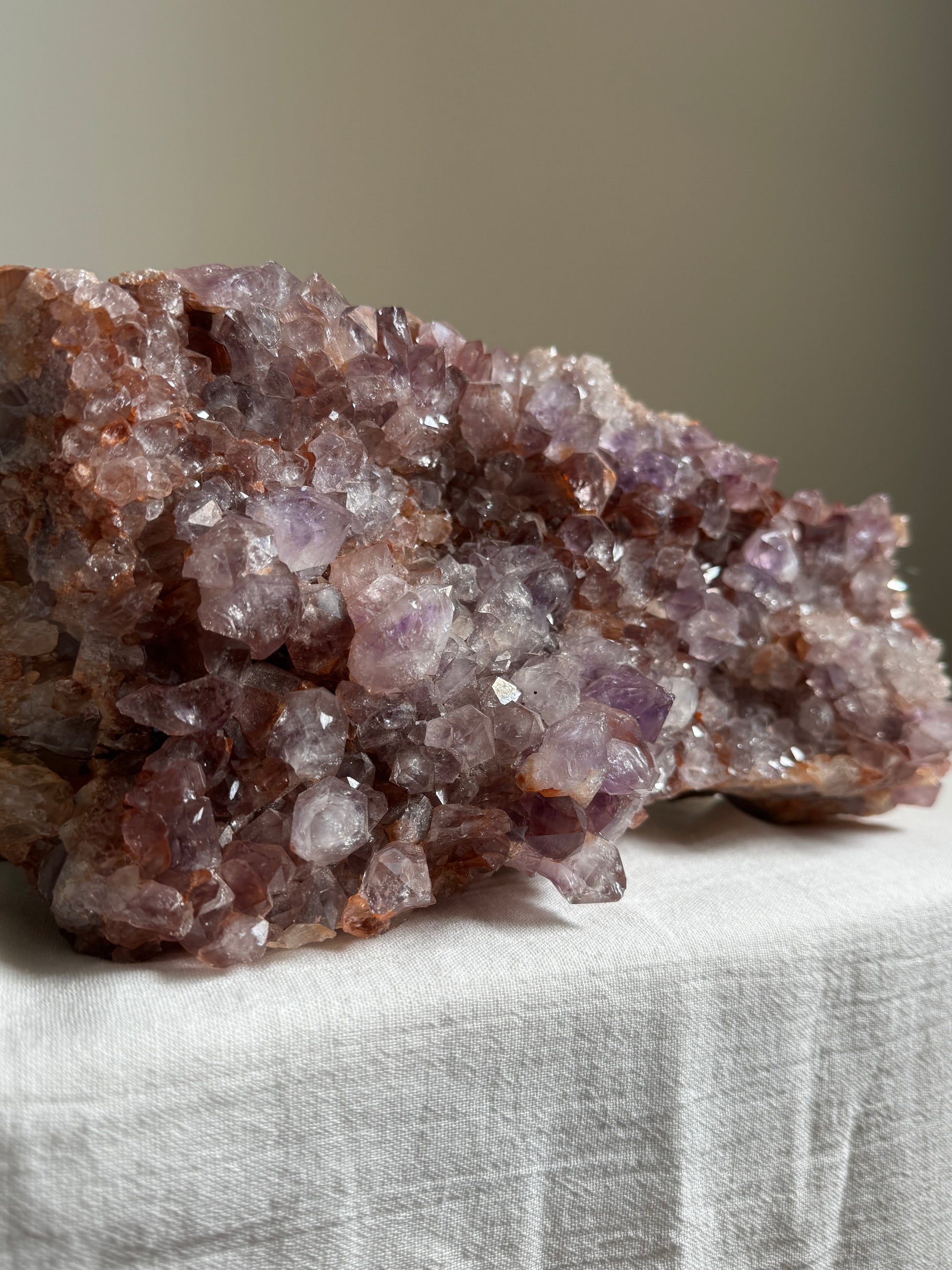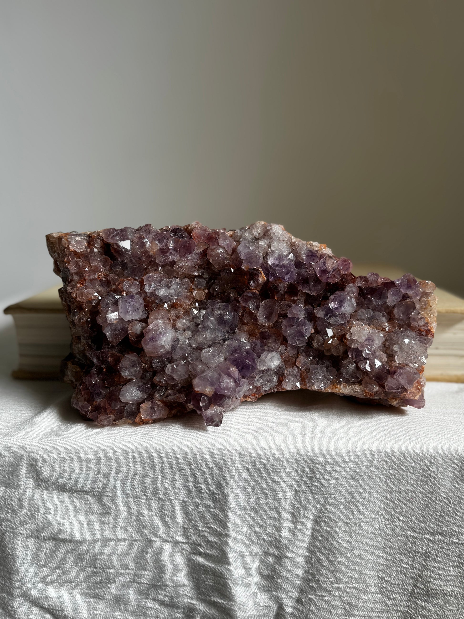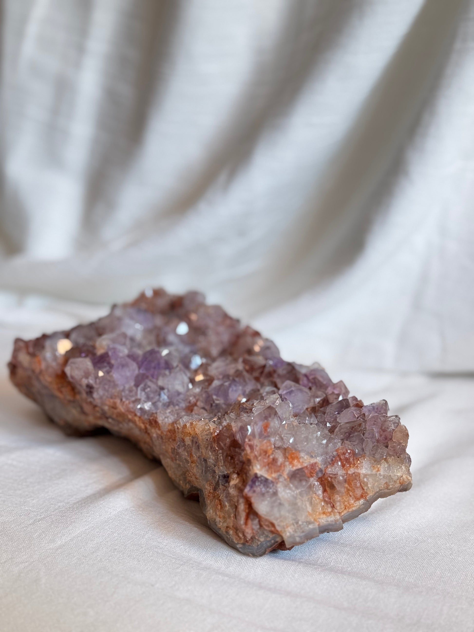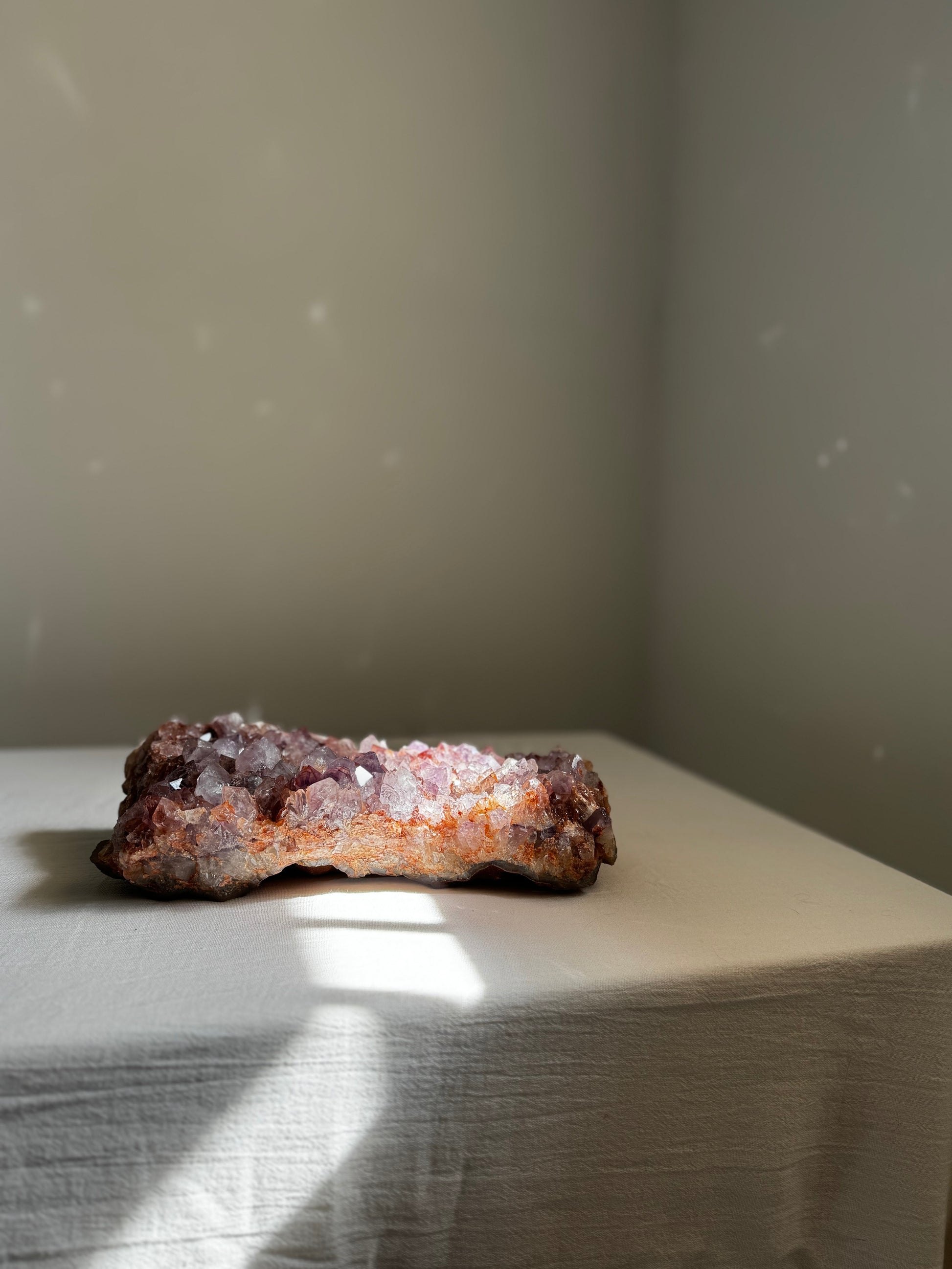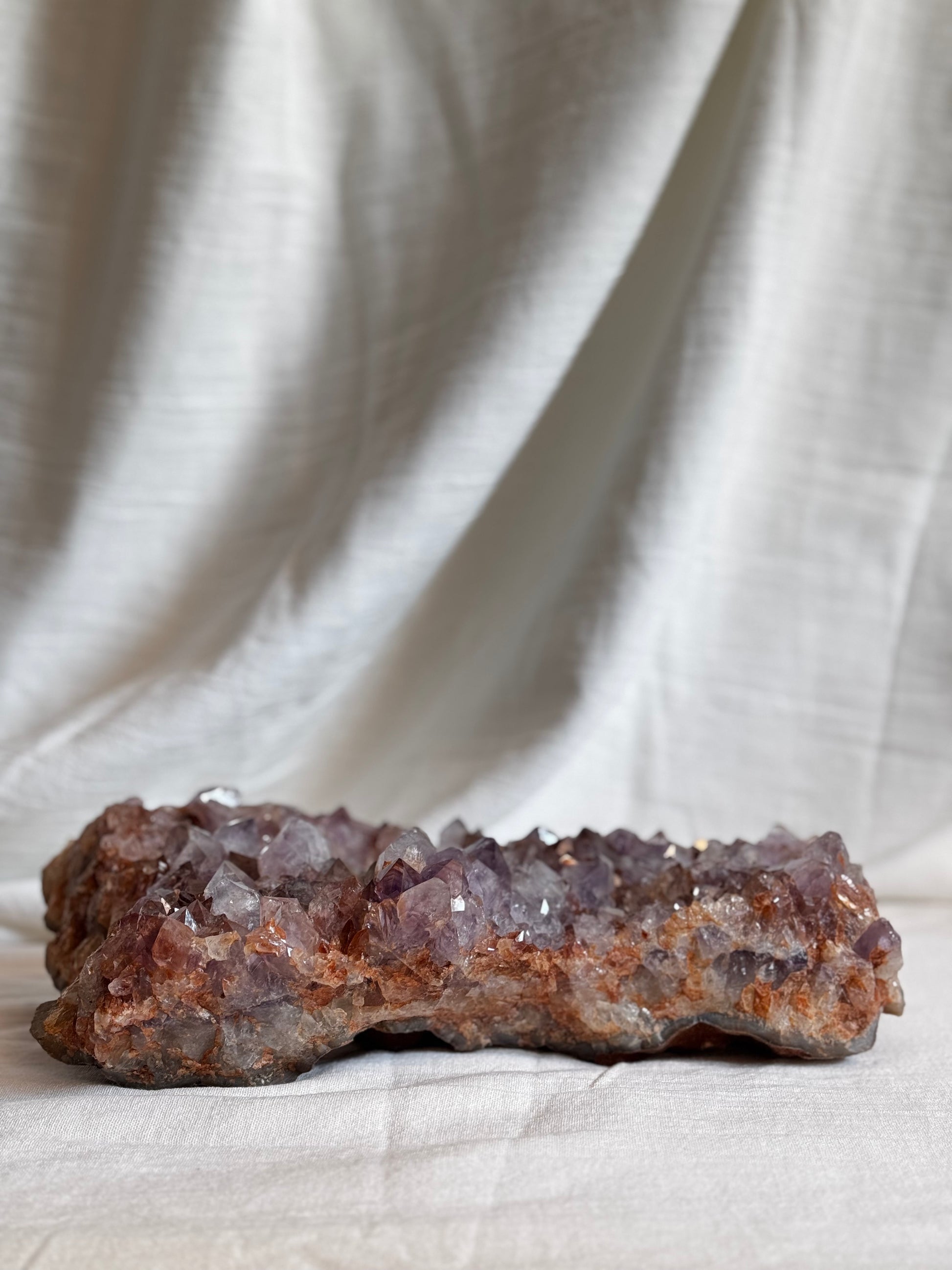 This stunning 7.4 lb Natural Amethyst from Northern Argentina is both a statement piece and a meaningful addition to any space, offering grounding energy and elevated beauty. This one-of-a-kind crystal showcases violet hues accented by earthy orange tones from its original matrix.