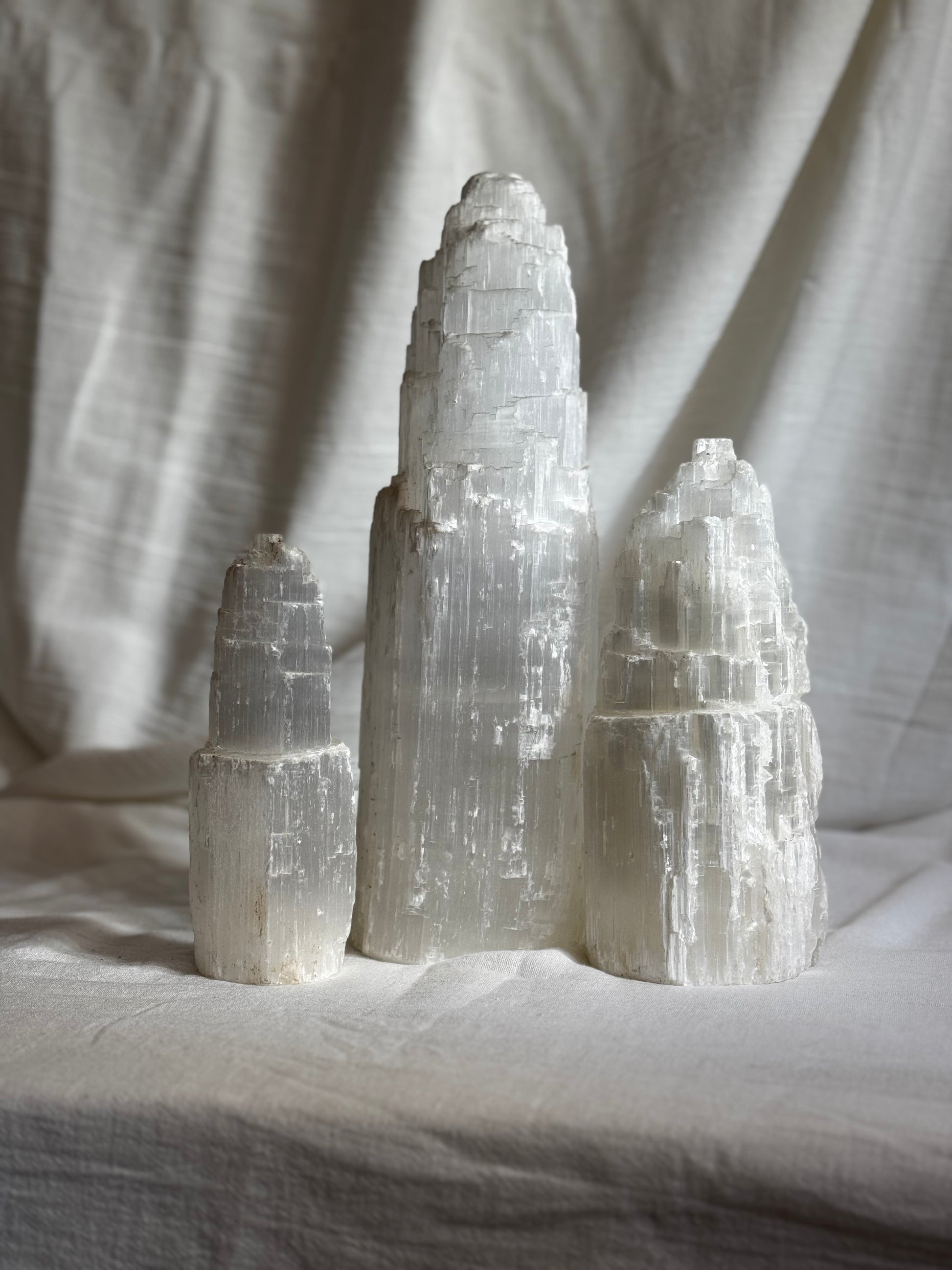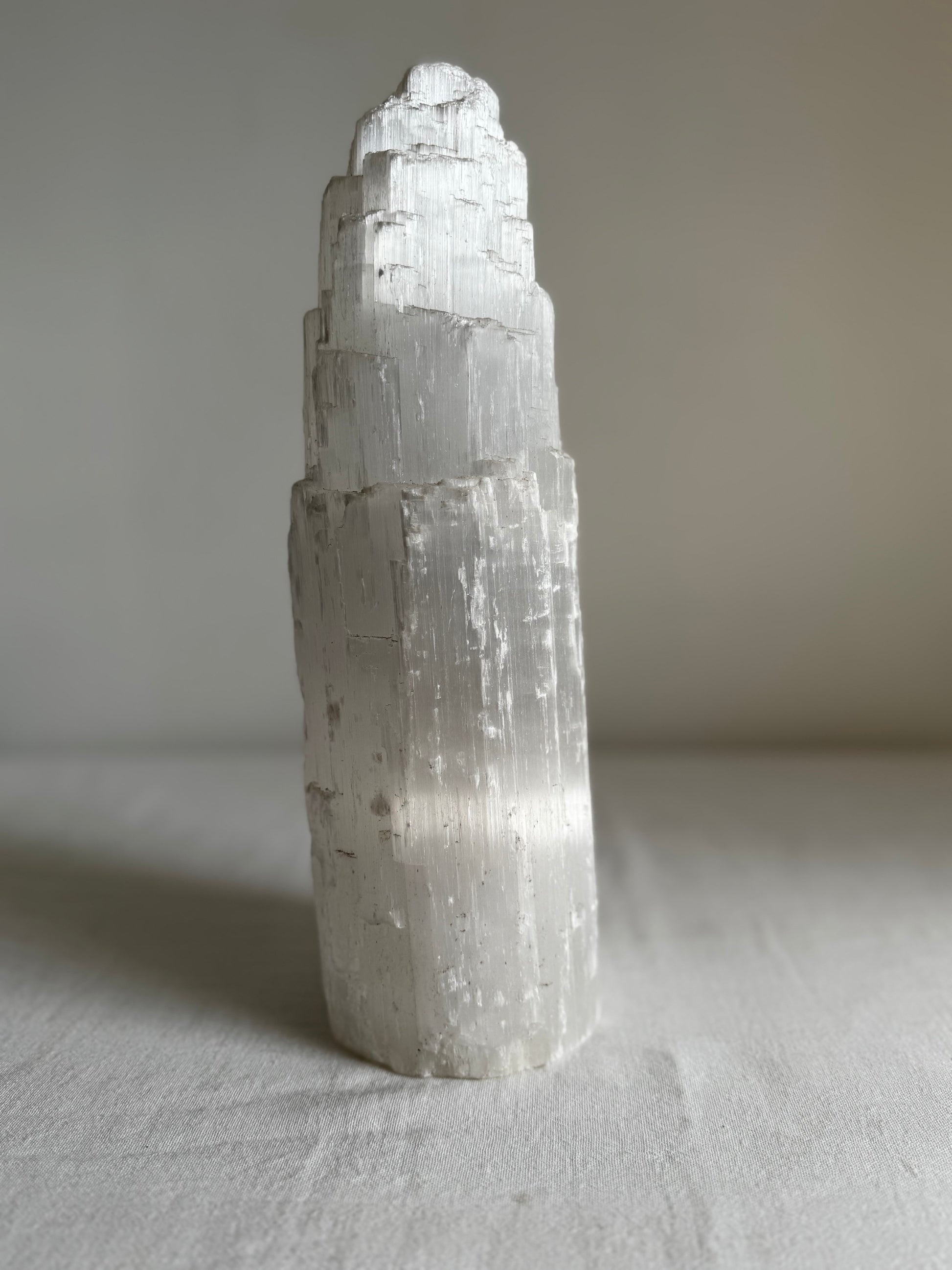 Bring calm to your space with these Selenite Tower Crystal, from Brazil. Known for its luminous, pearly-white sheen and natural striations, these crystals are Ideal for meditation spaces, energy grids, or home altars.