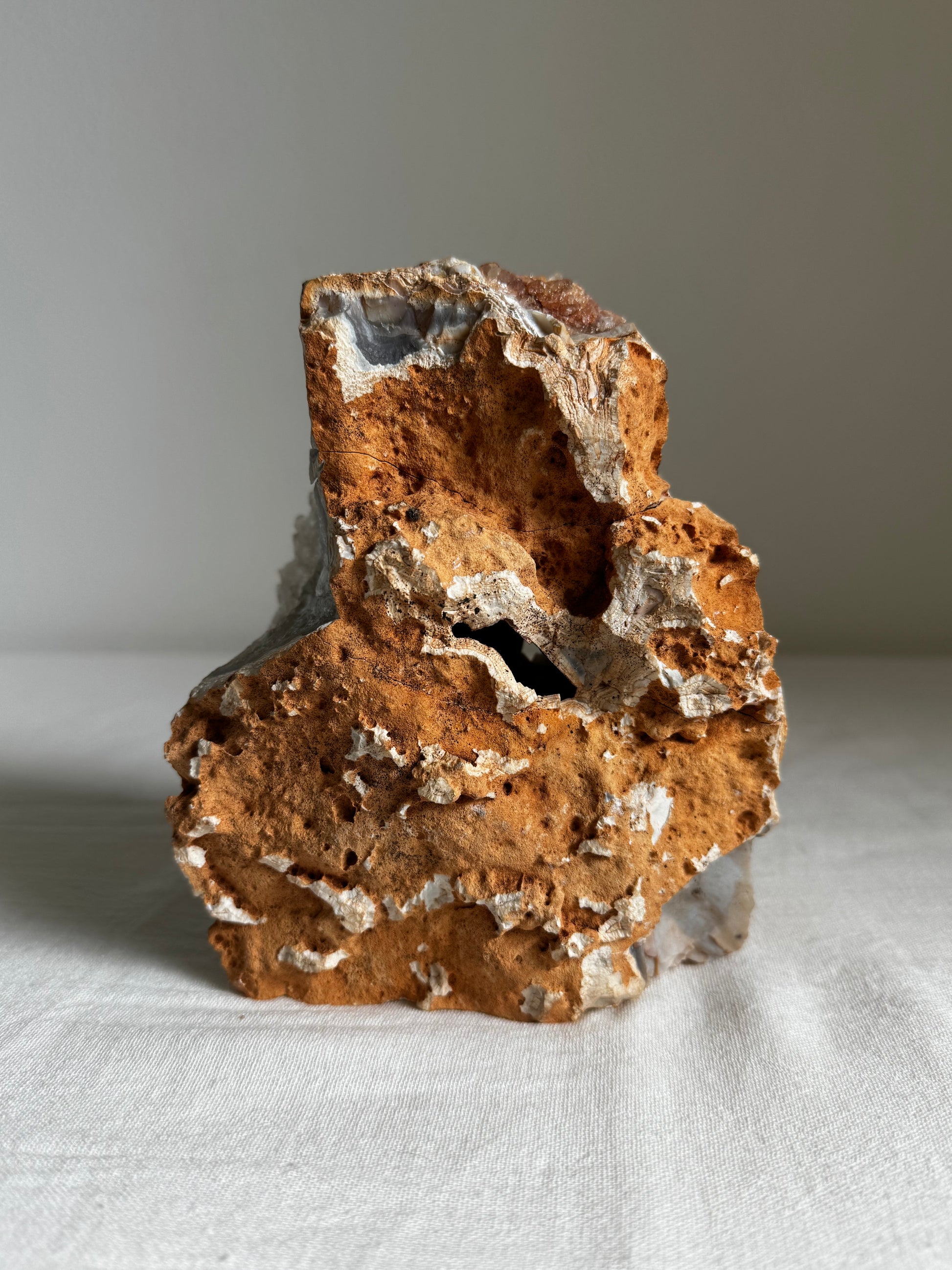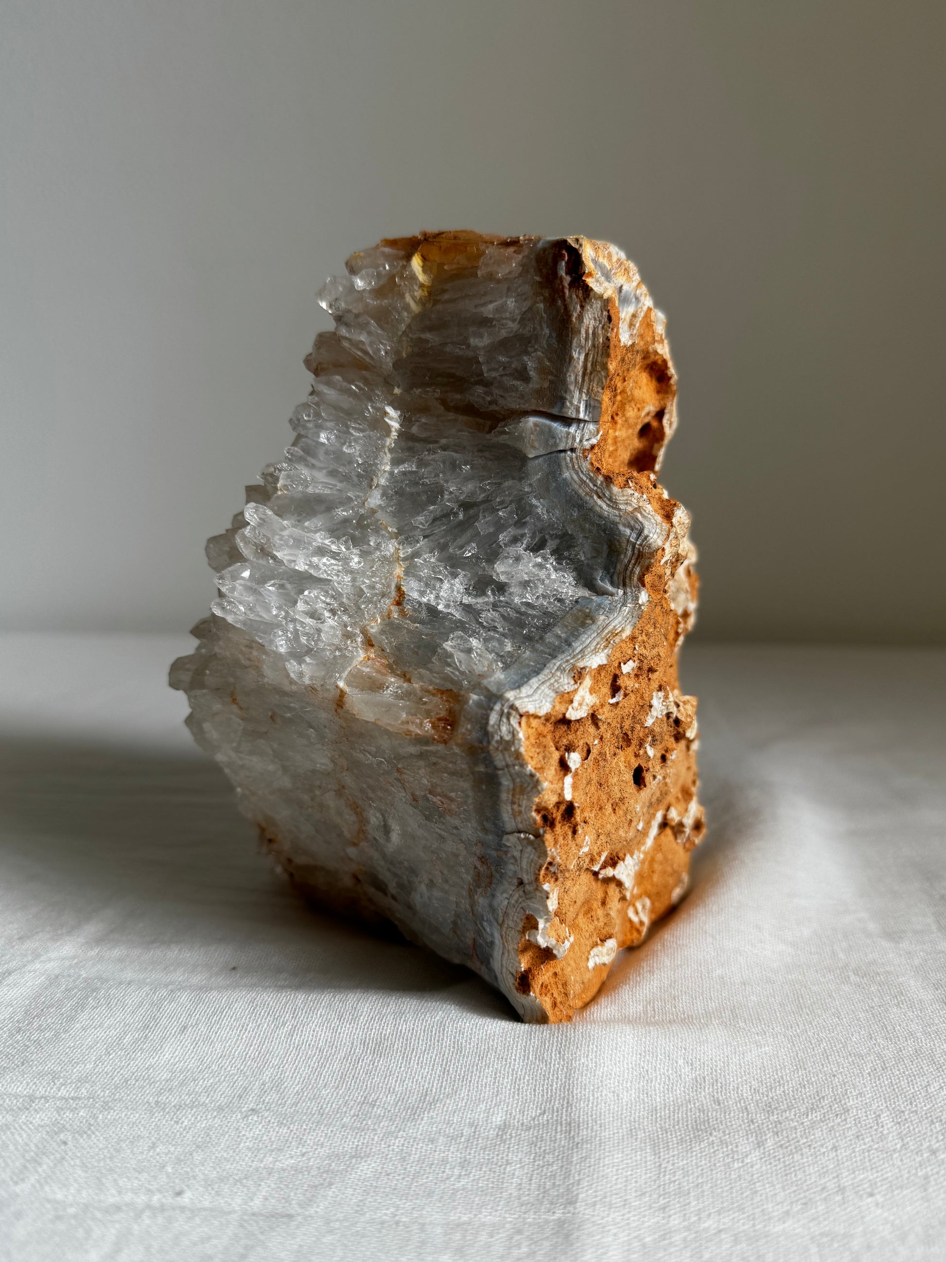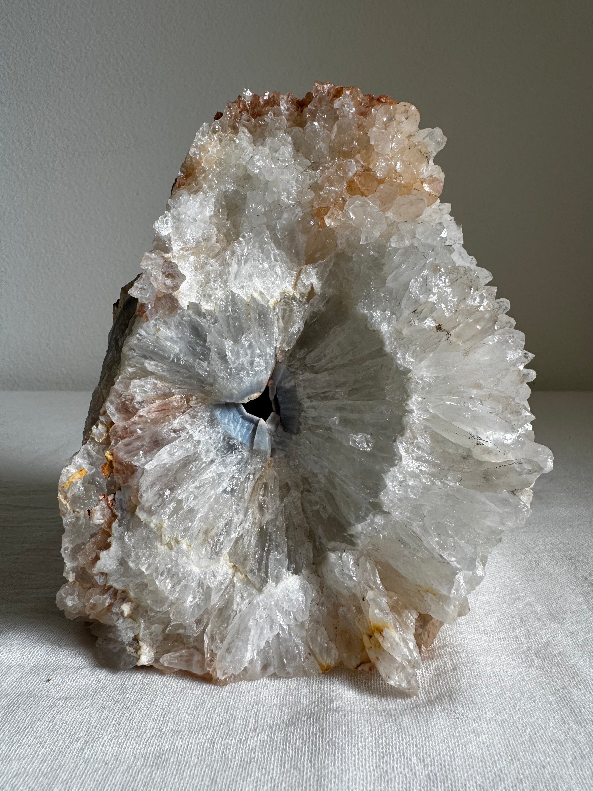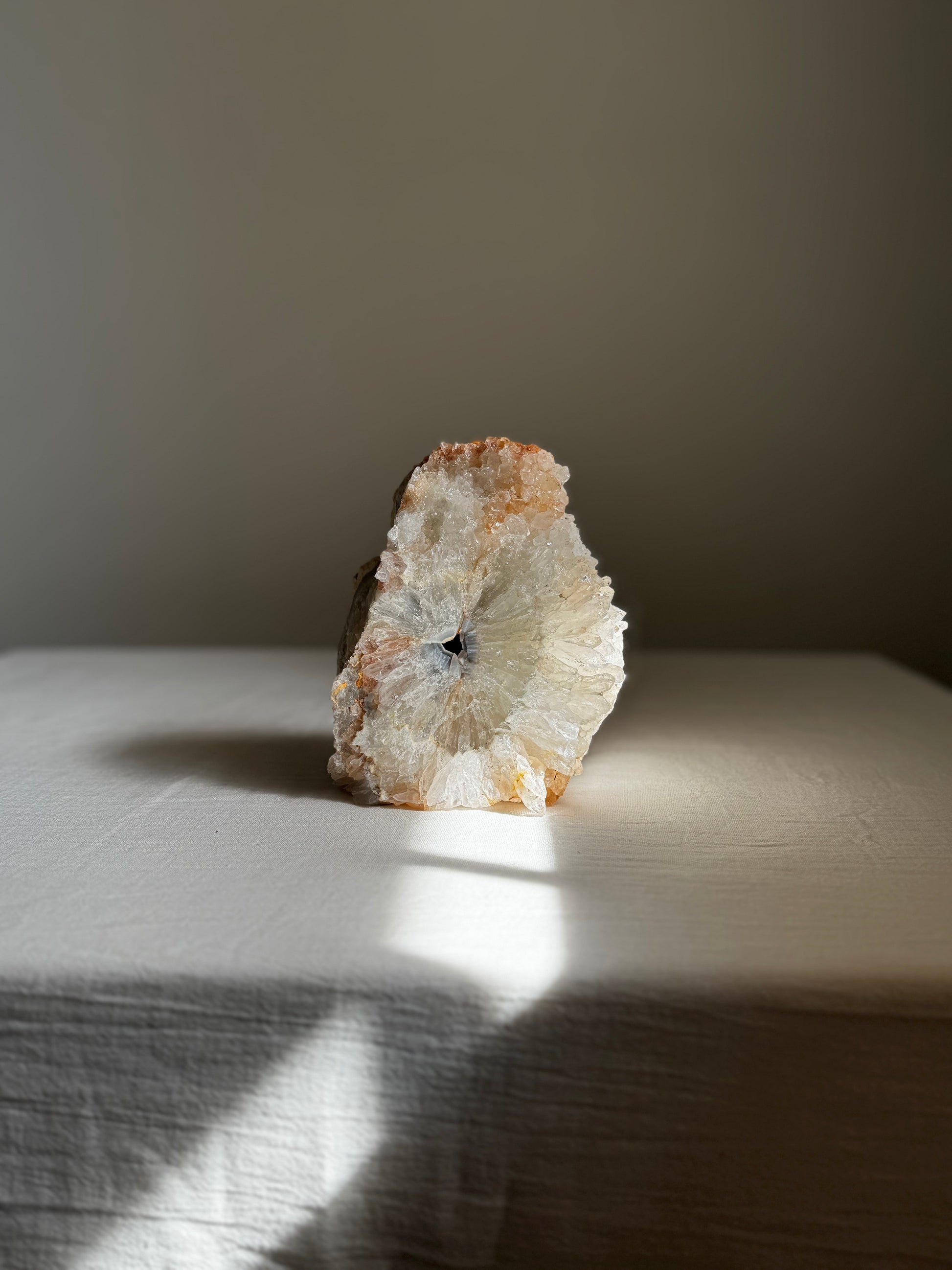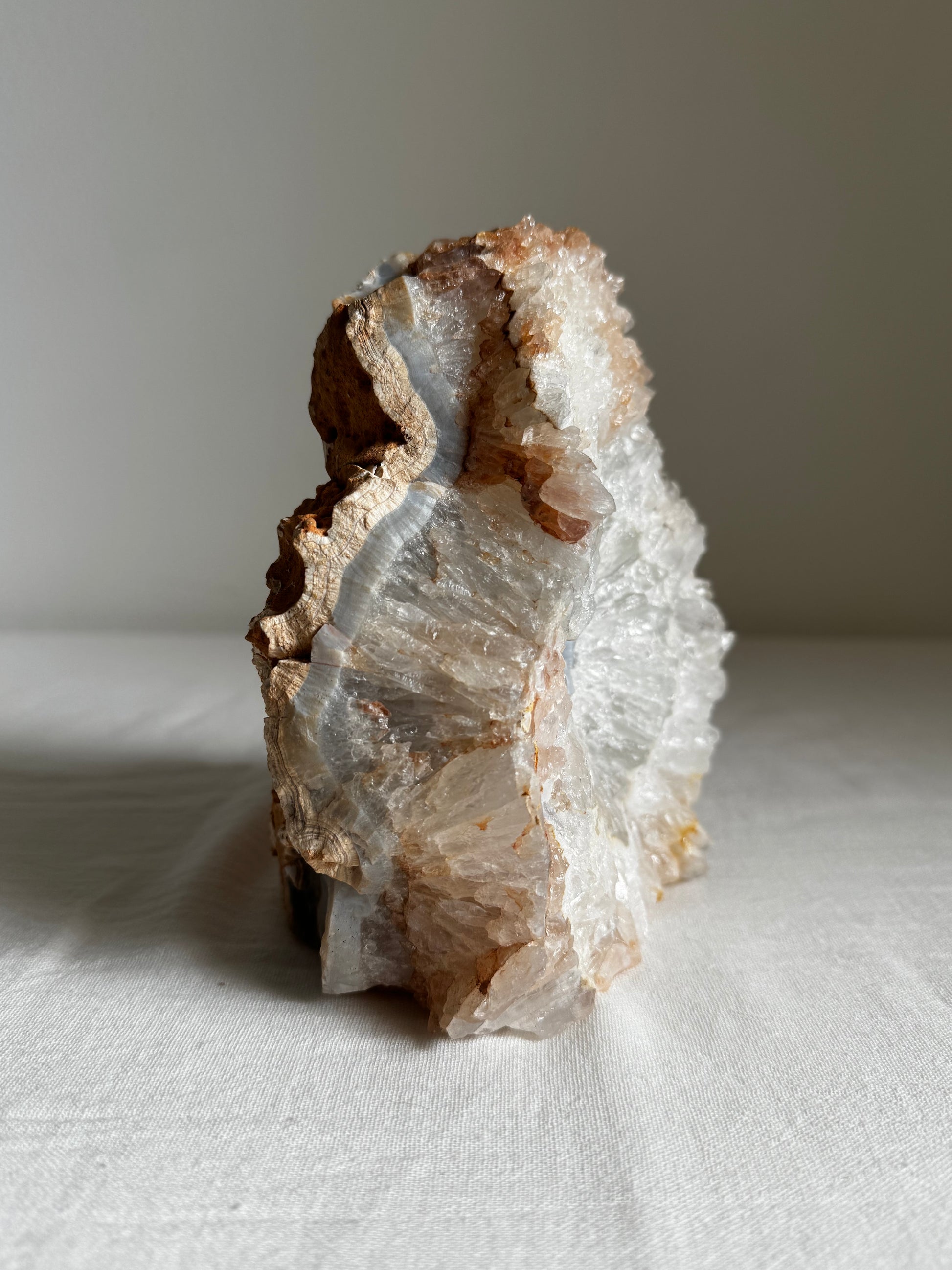Bring natural beauty and calming energy into your space with this stunning Natural White Quartz, from Argentina. This unique piece features crisp, white tones contrasted by warm orange hues, the result of iron-rich deposits from the original host rock, giving the piece its truly unique character.