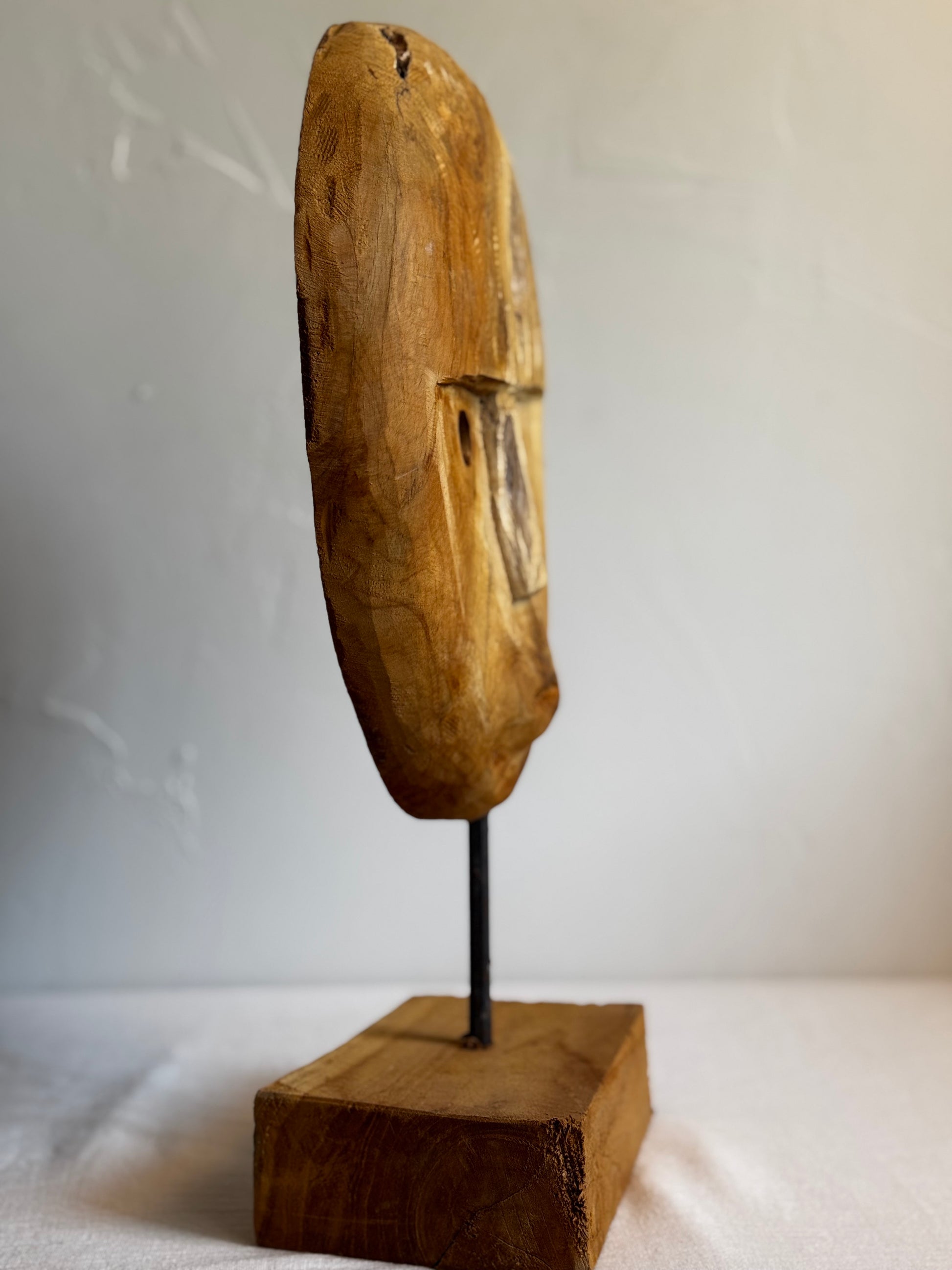 Handcrafted from reclaimed teak wood sourced from Indonesia, this Sumbanese mask sculpture is a one-of-a-kind piece that brings cultural richness and natural elegance to your space.