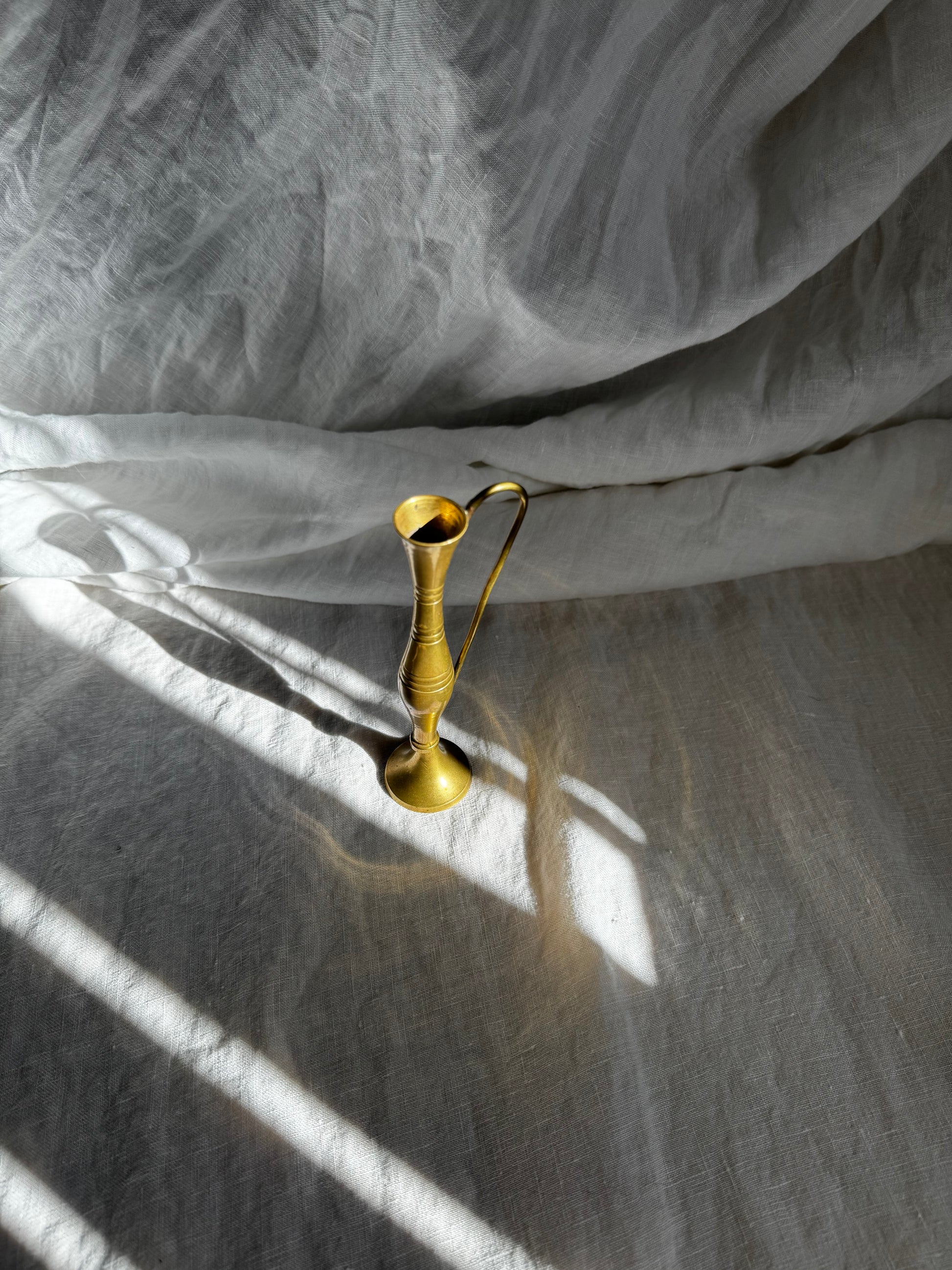 Discovered in a quiet town in Argentina, this vintage brass bud vase brings a touch of understated elegance to any space. Its warm patina and simple silhouette make it the perfect final detail for your shelf, bedside, or design project.
