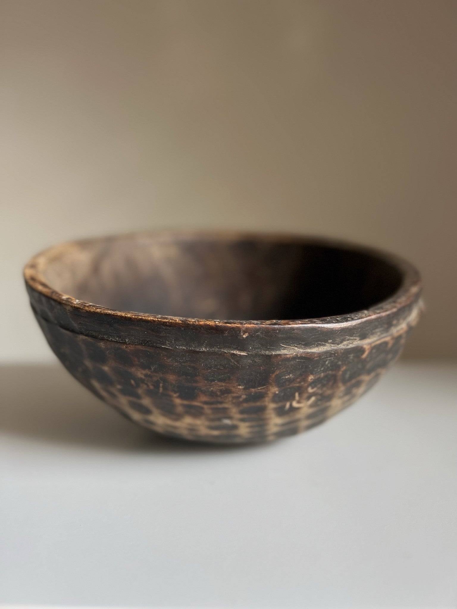This hand-carved milk bowl from West Africa is a one-of-a-kind vintage piece, believed to have been crafted by the Fulani (Fula) tribespeople in the mid-20th century. Made with exceptional skill passed down through generations, it was traditionally used for preparing, serving, or storing food. The bowl features a beautifully aged patina and natural wear that reflect its rich history.