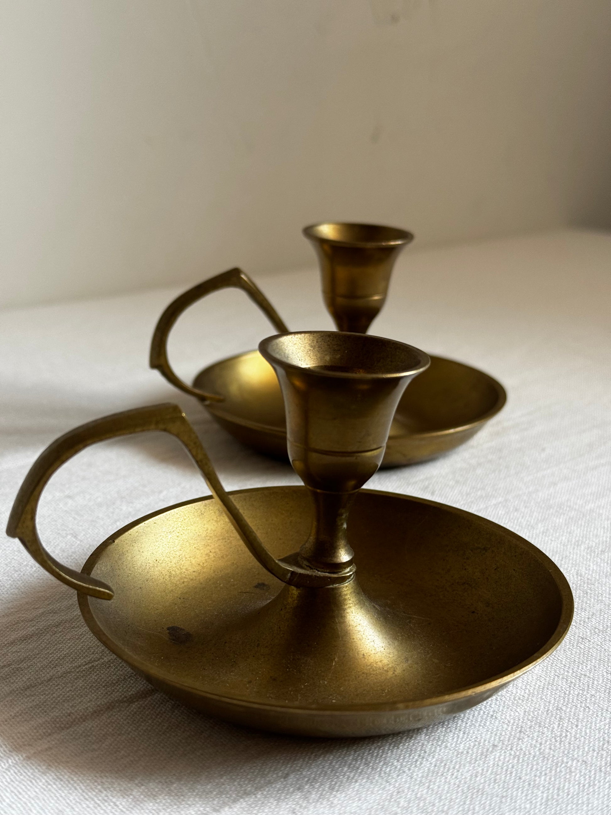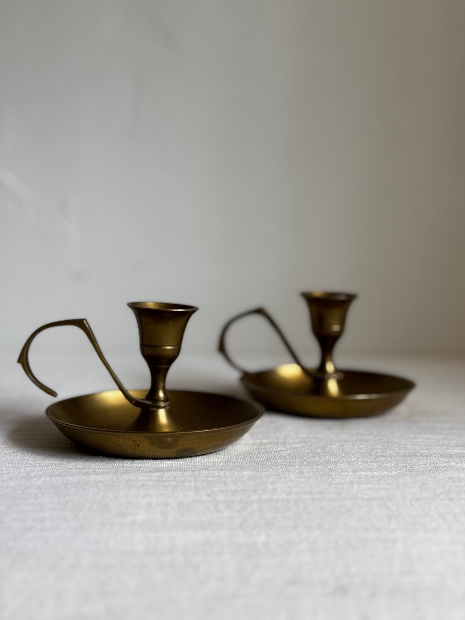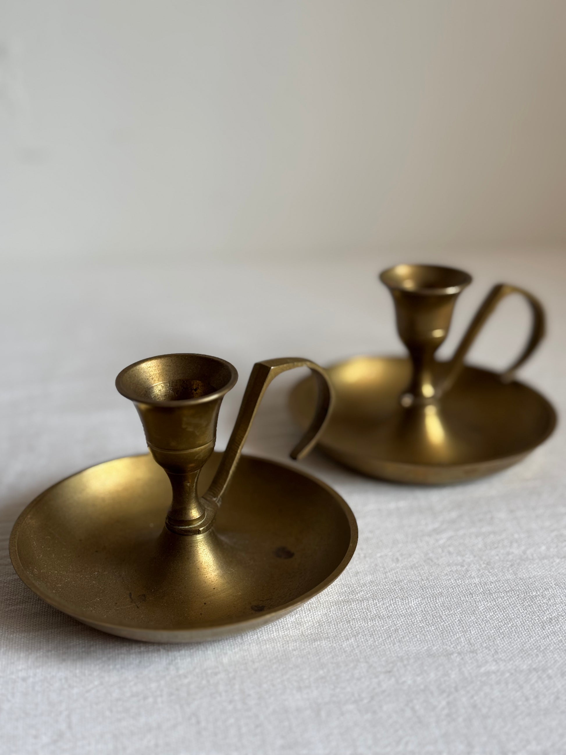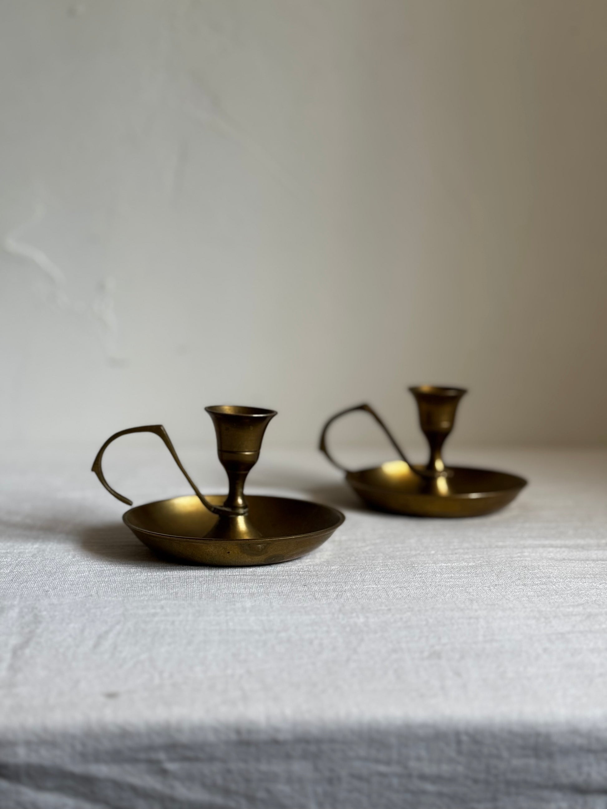 This vintage brass candle holder features a classic finger loop design, inspired by traditional chambersticks from the past. Crafted from solid brass, it has a warm, aged patina that adds character and timeless style to any space.