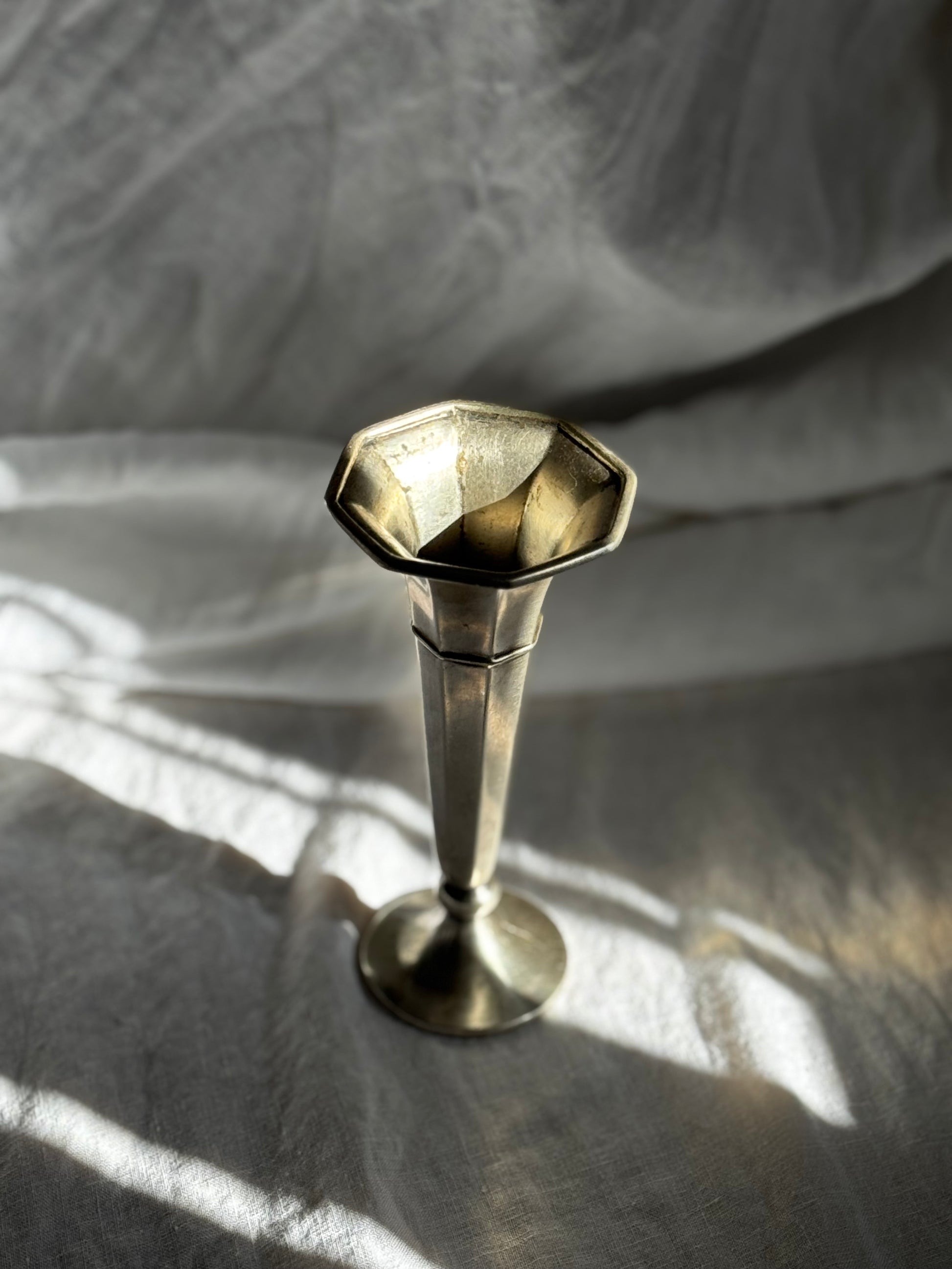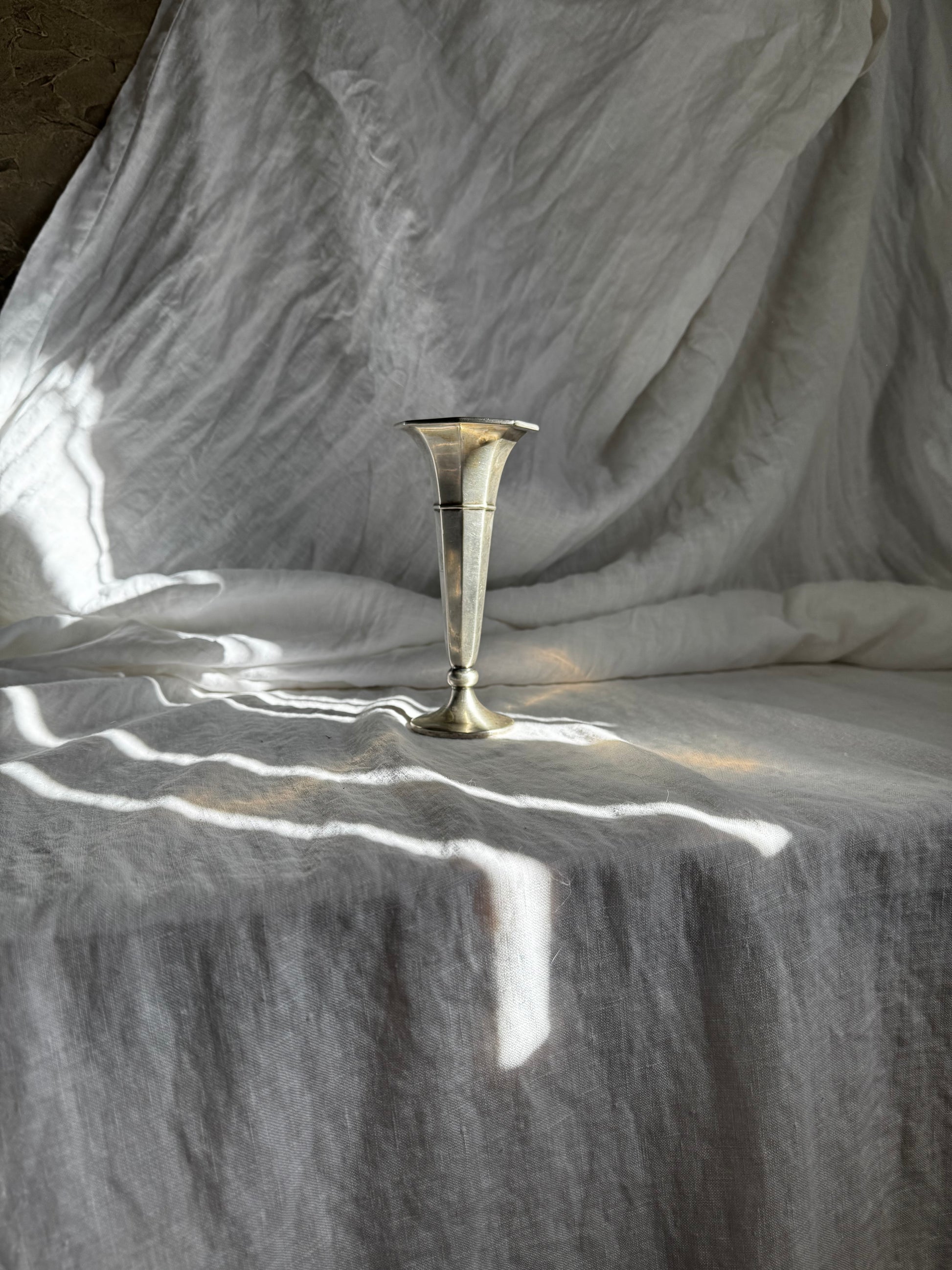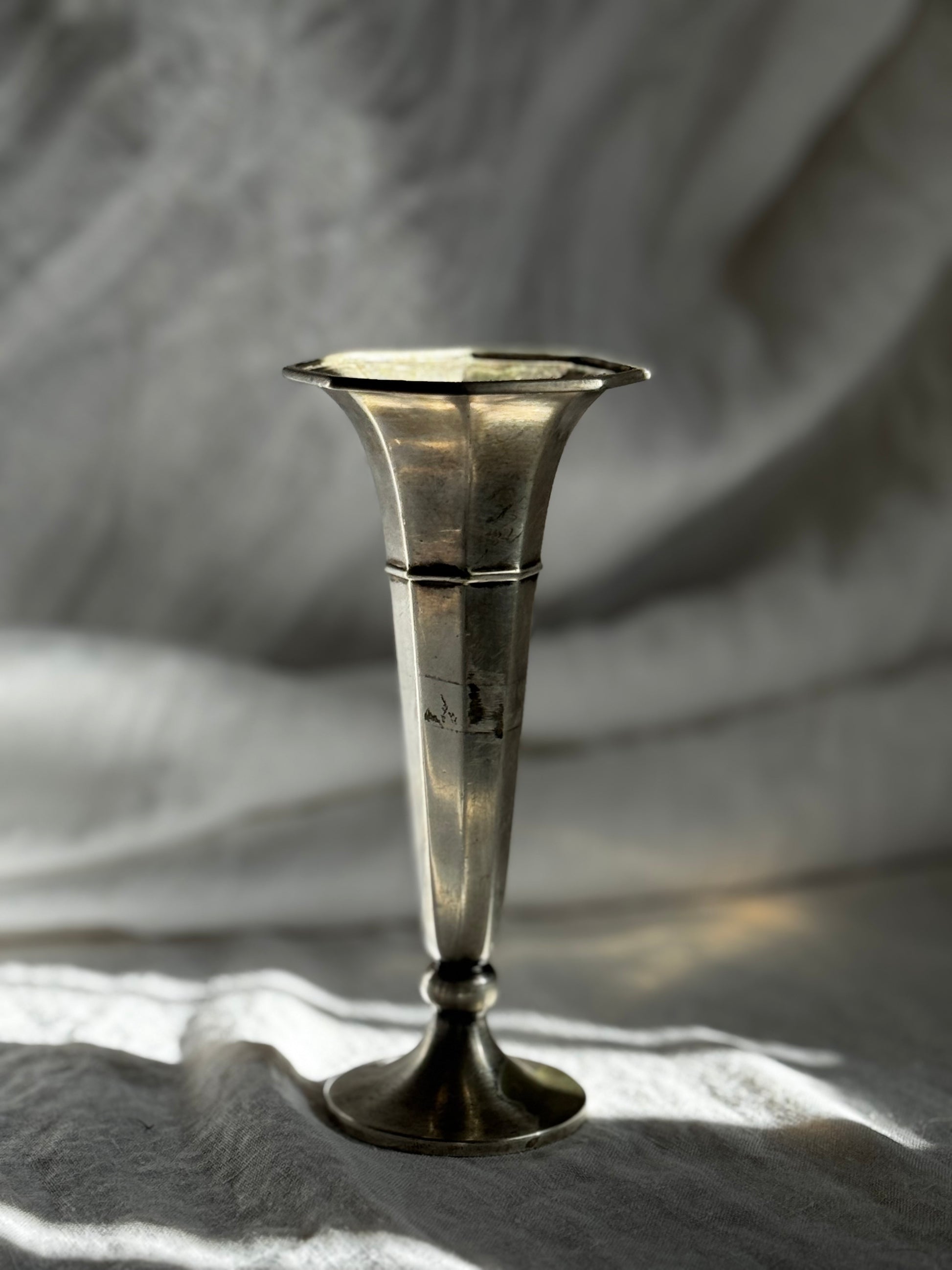 This elegant silver-plated trumpet vase was crafted by the renowned Alexander Clark & Co., founded in London in 1890 and later incorporated, with manufacturing based in Birmingham from 1918.