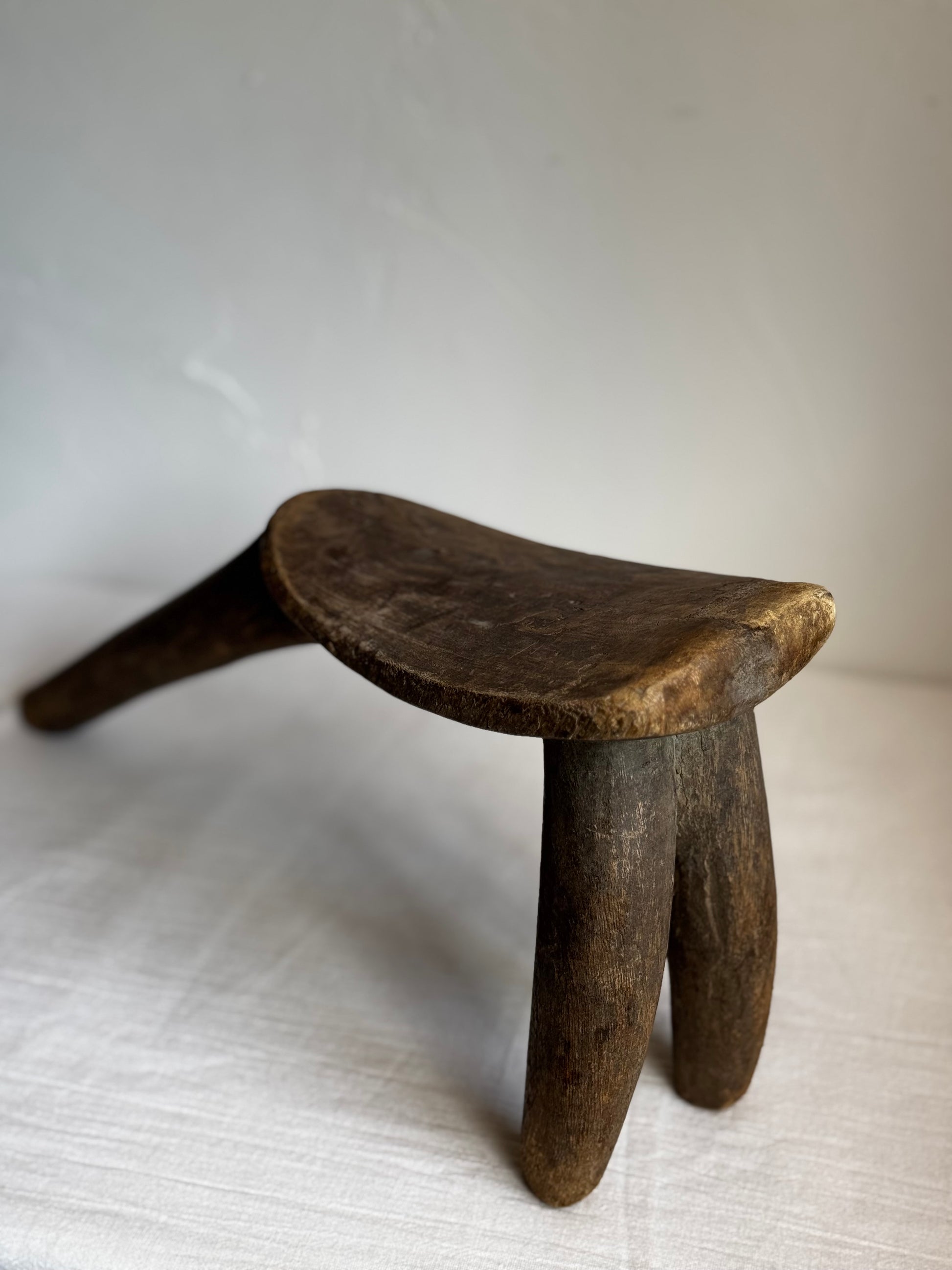 Step into the rich heritage of West African tribal art with this authentic Lobi Tripod Stool from Burkina Faso. In Lobi culture, these stools were prized personal possessions of men, symbolizing status and virility. Carved from a single piece of indigenous hardwood, its elegant, functional form was designed to be carried over the shoulder during travels.