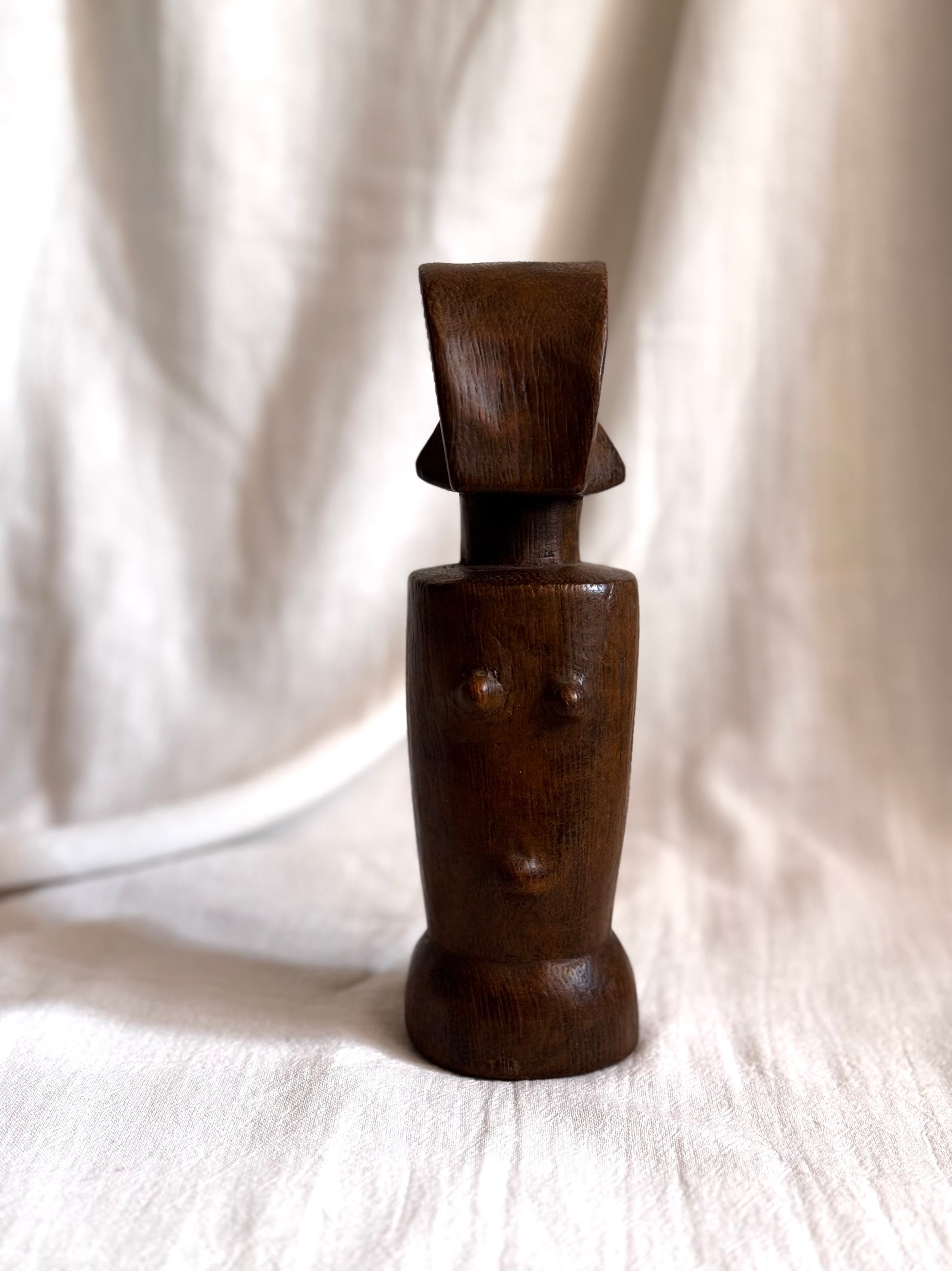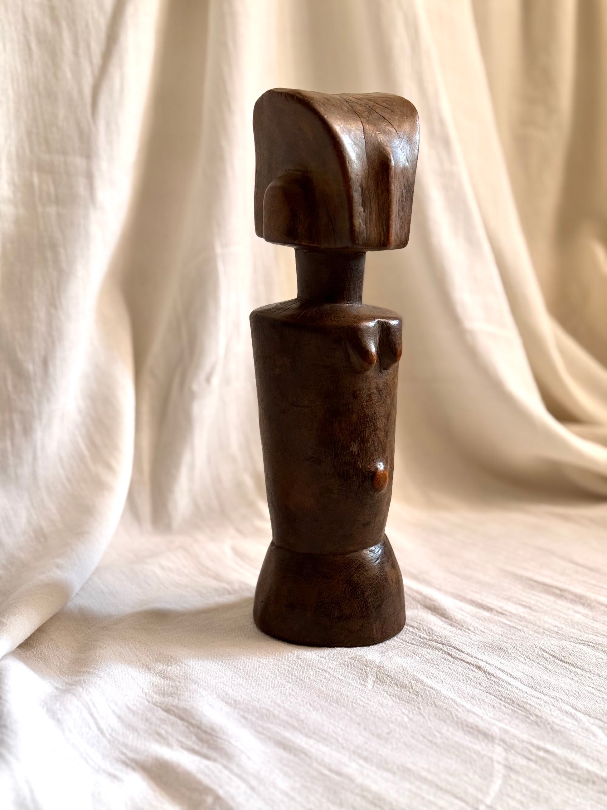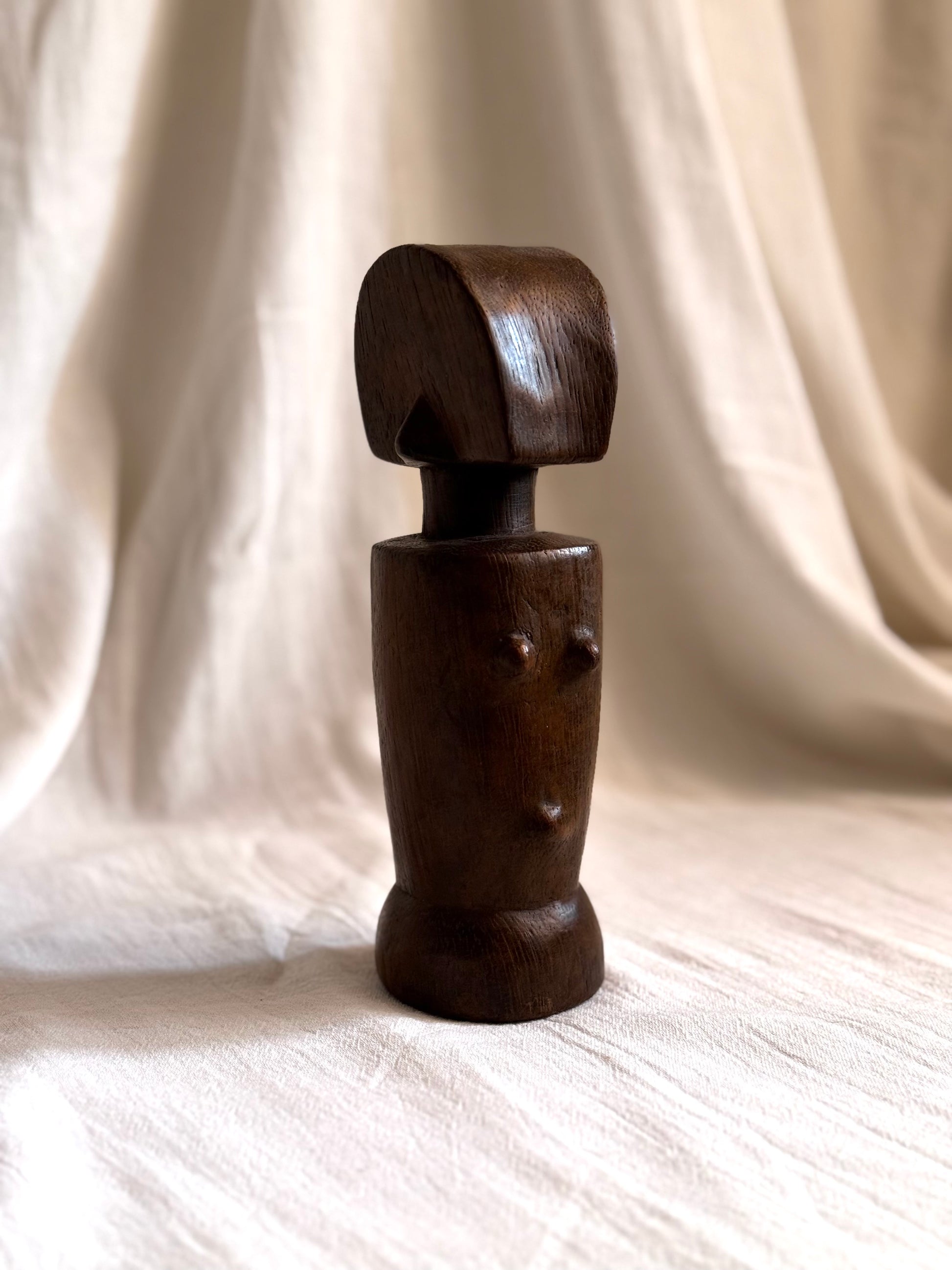 This Nyamwezi Mwana Hiti figure -meaning “child of wood”- originates from Tanzania and holds deep cultural and symbolic significance. Traditionally gifted to young girls by their maternal uncles during initiation ceremonies, these figures served as companions and educational tools, guiding them in the values of sexuality, womanhood, fertility, and family life.