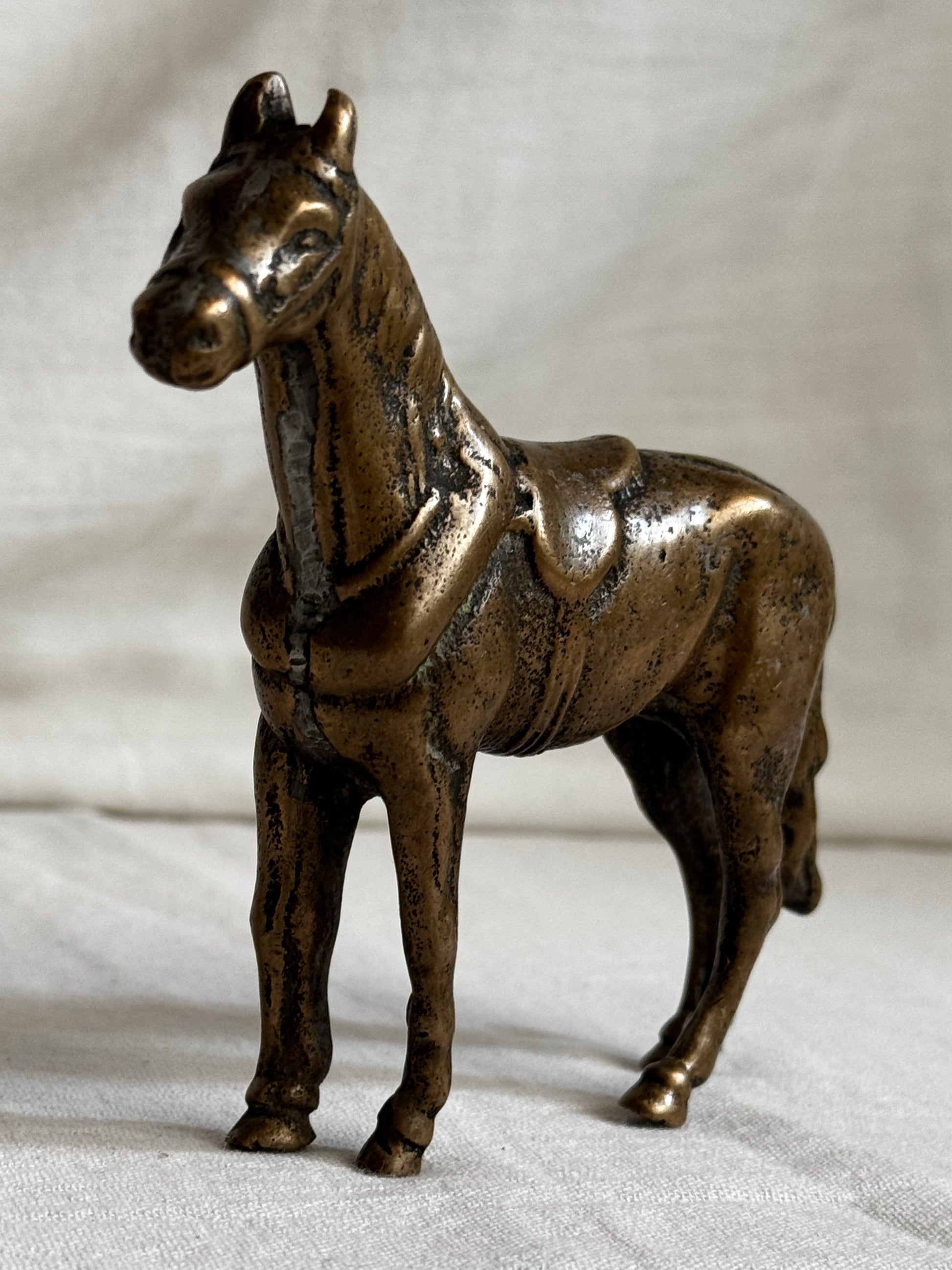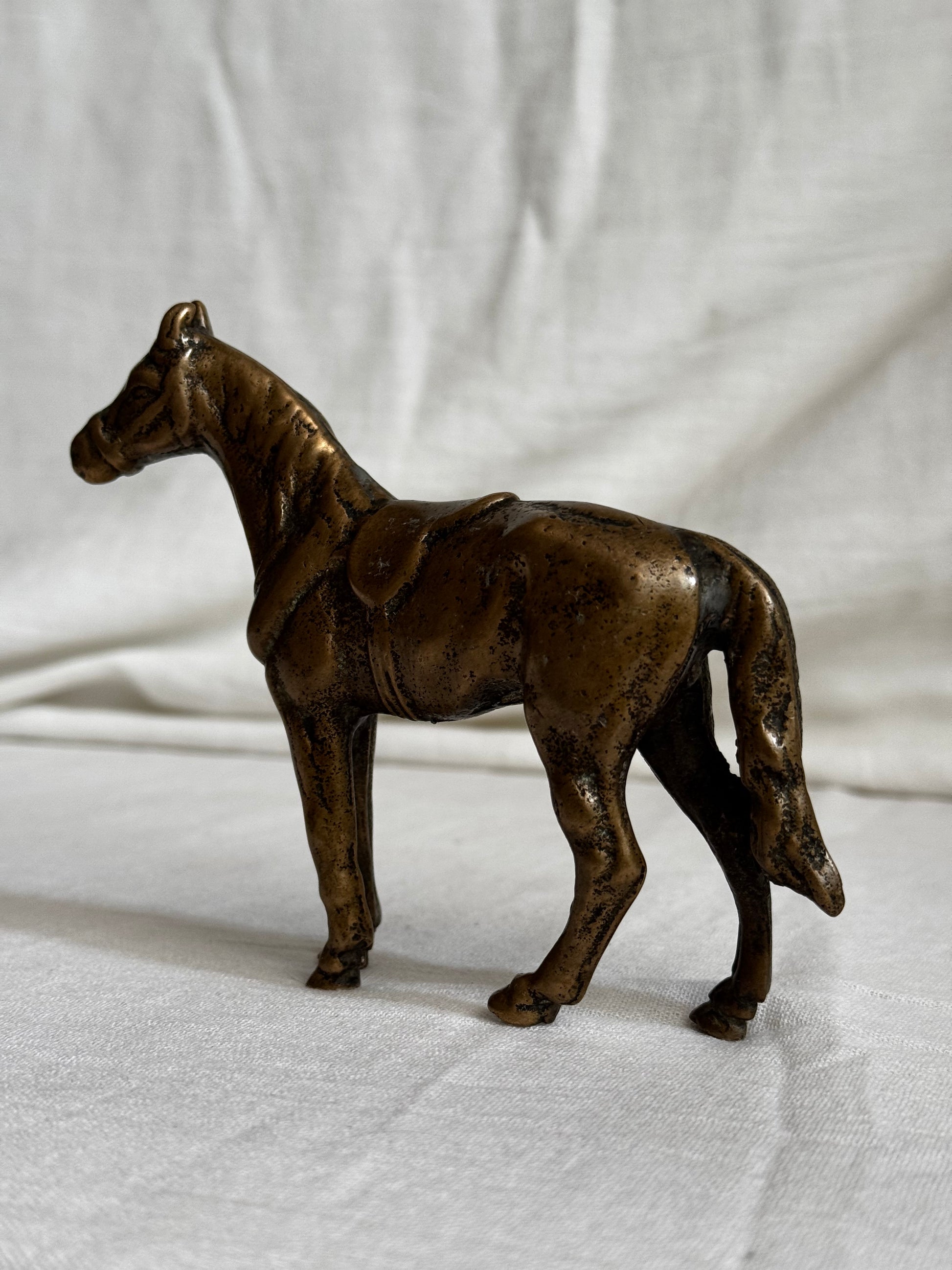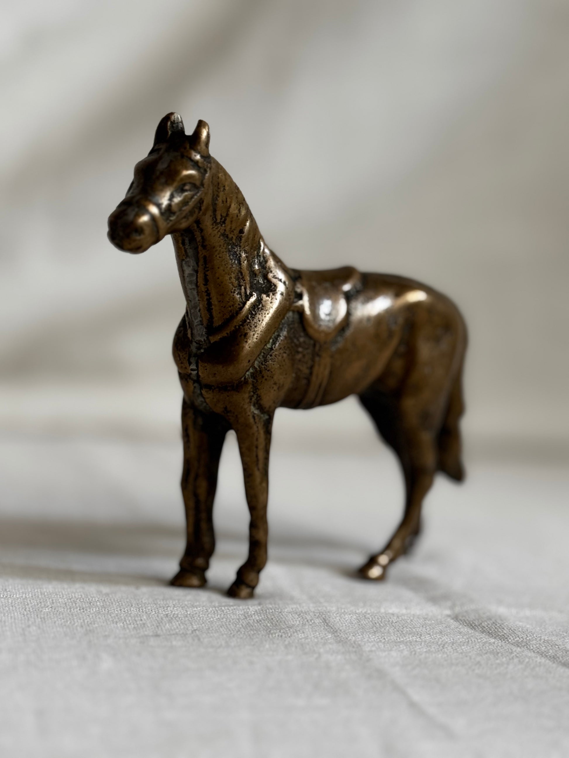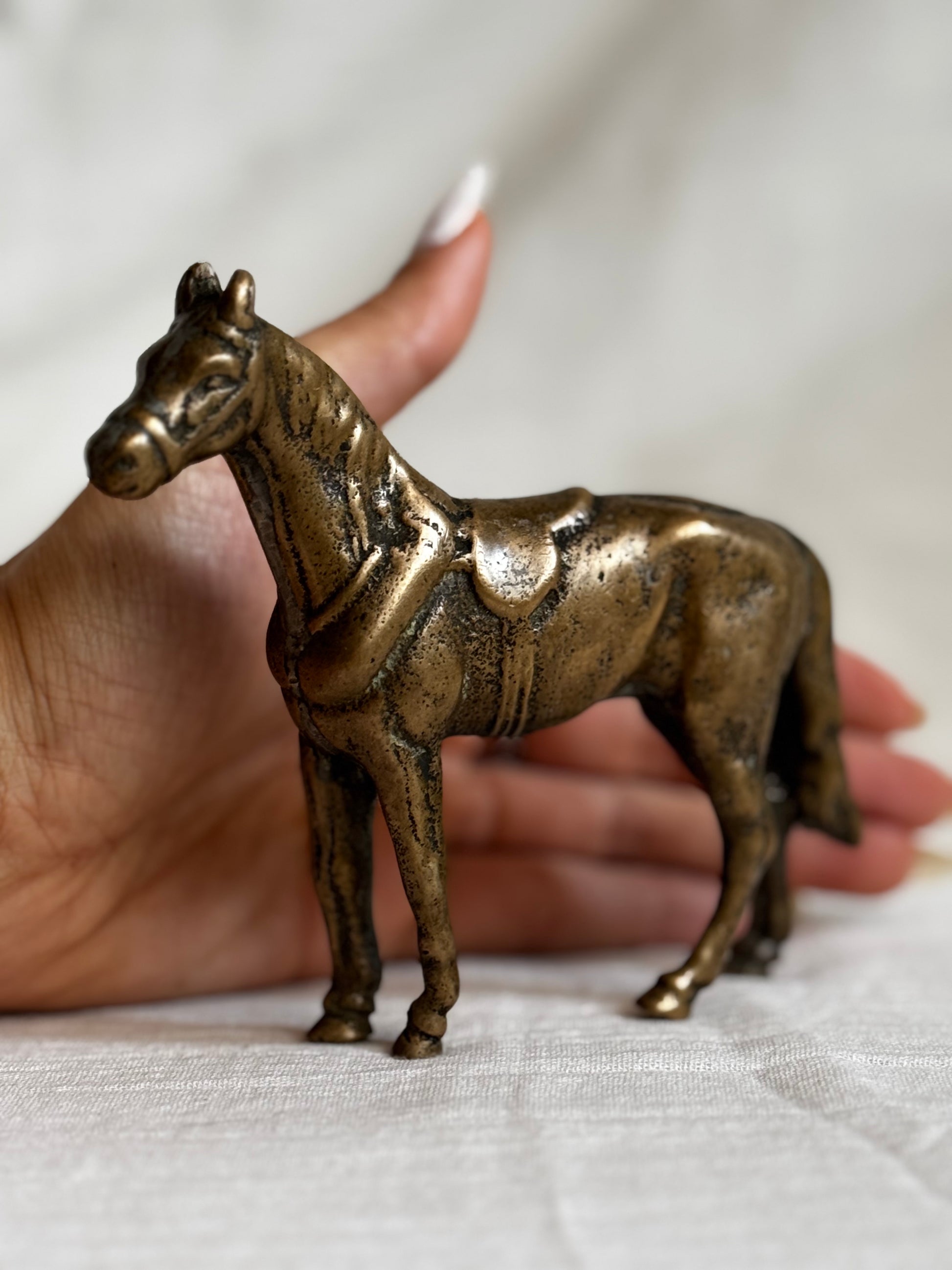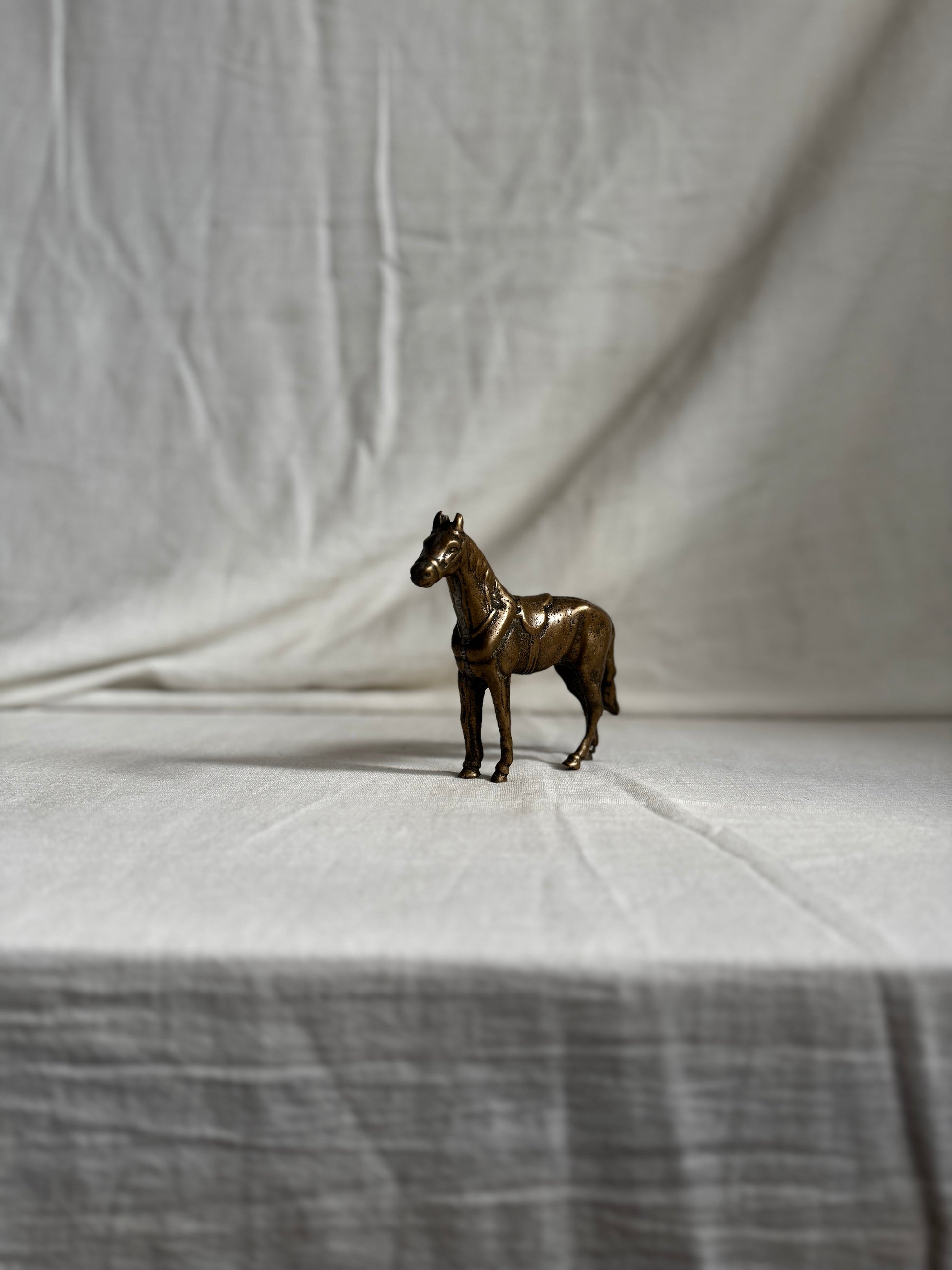 Its compact size makes it a versatile styling piece perfect for a bookshelf, tabletop, or layered into a curated vignette. Whether displayed on its own or alongside other collected objects, this brass horse adds a refined, sculptural touch to any space.