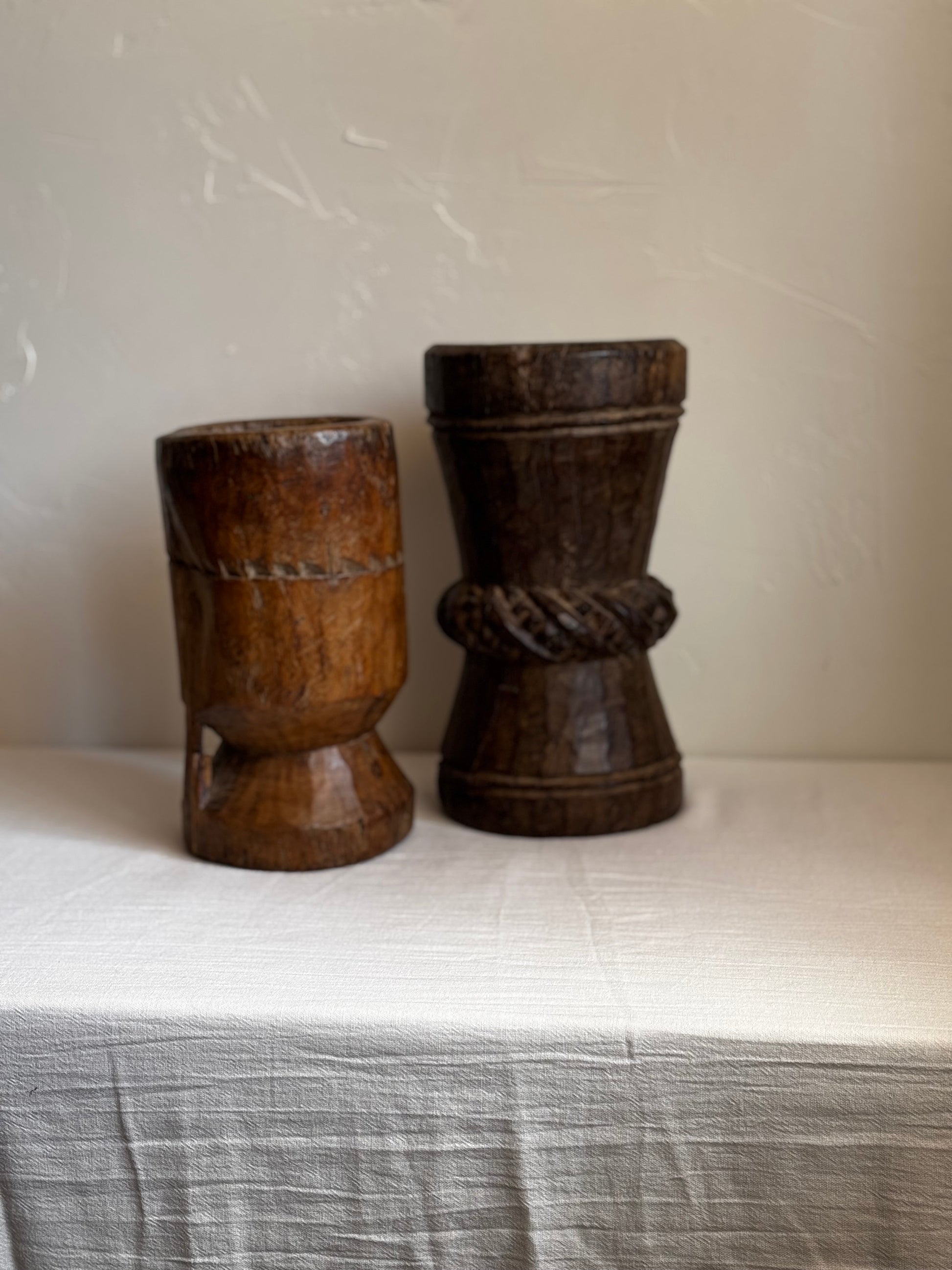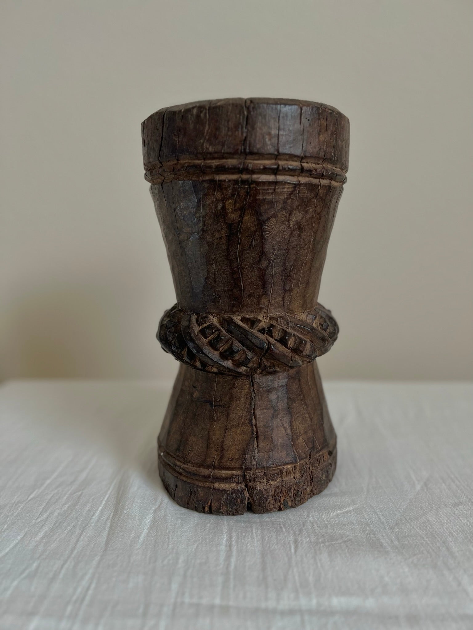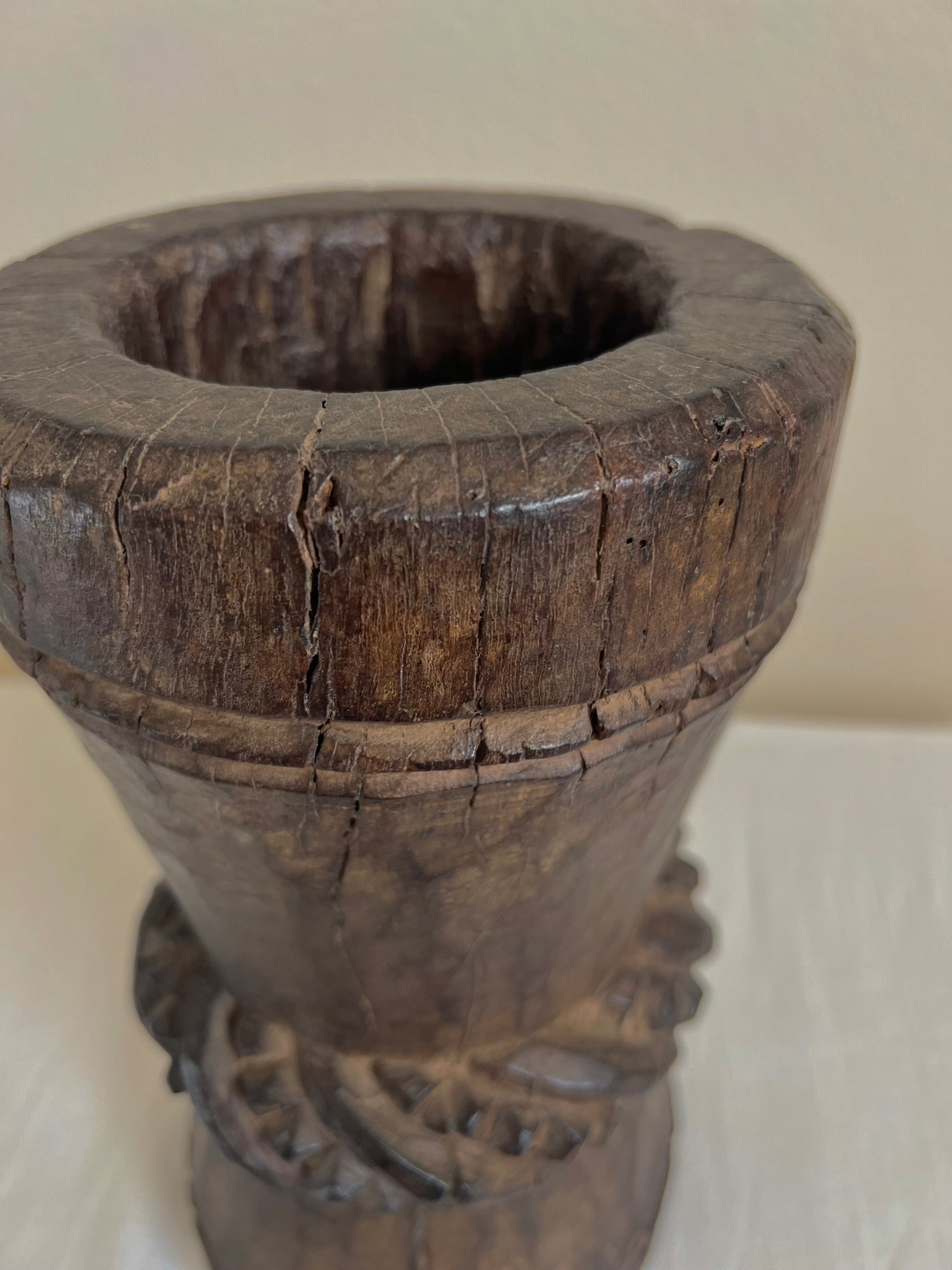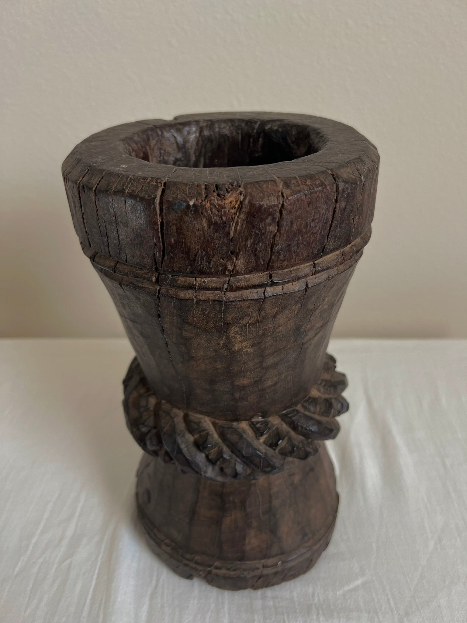 This primitive vintage hand-carved wooden mortar from India was traditionally used for grinding spices. Its aged surface and wear from years of use give it a unique character, making it a rare, one-of-a-kind piece.